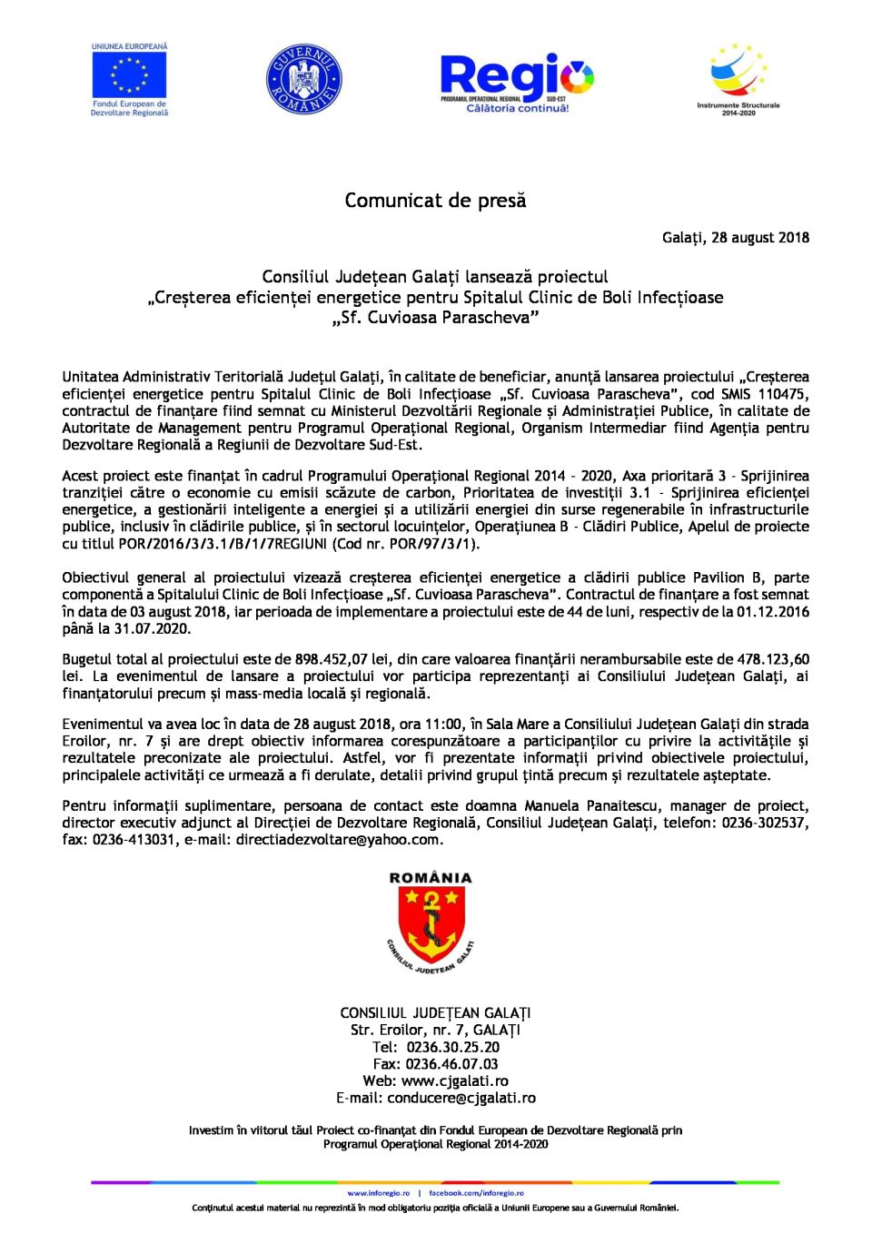 Unitatea Administrativ Teritorială Judeţul Galaţi, în calitate de beneficiar, anunță lansarea proiectului „Creșterea eficienței energetice pentru Spitalul Clinic de Boli Infecțioase „Sf. Cuvioasa Parascheva”, cod SMIS 110475, contractul de finanțare fiind semnat cu Ministerul Dezvoltării Regionale și Administraţiei Publice, în calitate de Autoritate de Management pentru Programul Operaţional Regional, Organism Intermediar fiind Agenţia pentru Dezvoltare Regională a Regiunii de Dezvoltare Sud-Est.