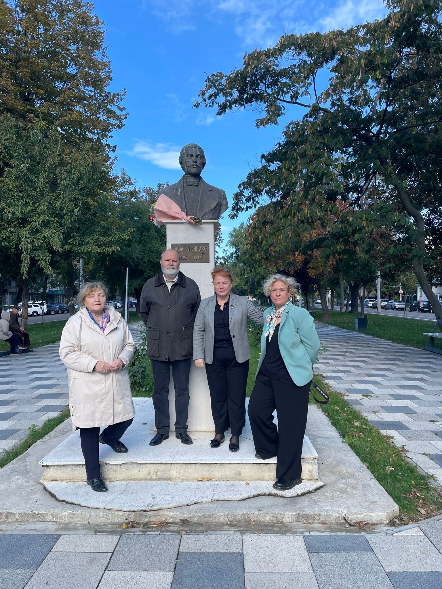 E.S. Enkeleda Merkuri, Leonard Basturescu, prof. univ. dr. ing. Doina Banciu şi dr. Brîndușa-Oana Ilie, la statuia lui Naum Vechilhagi din Brăila