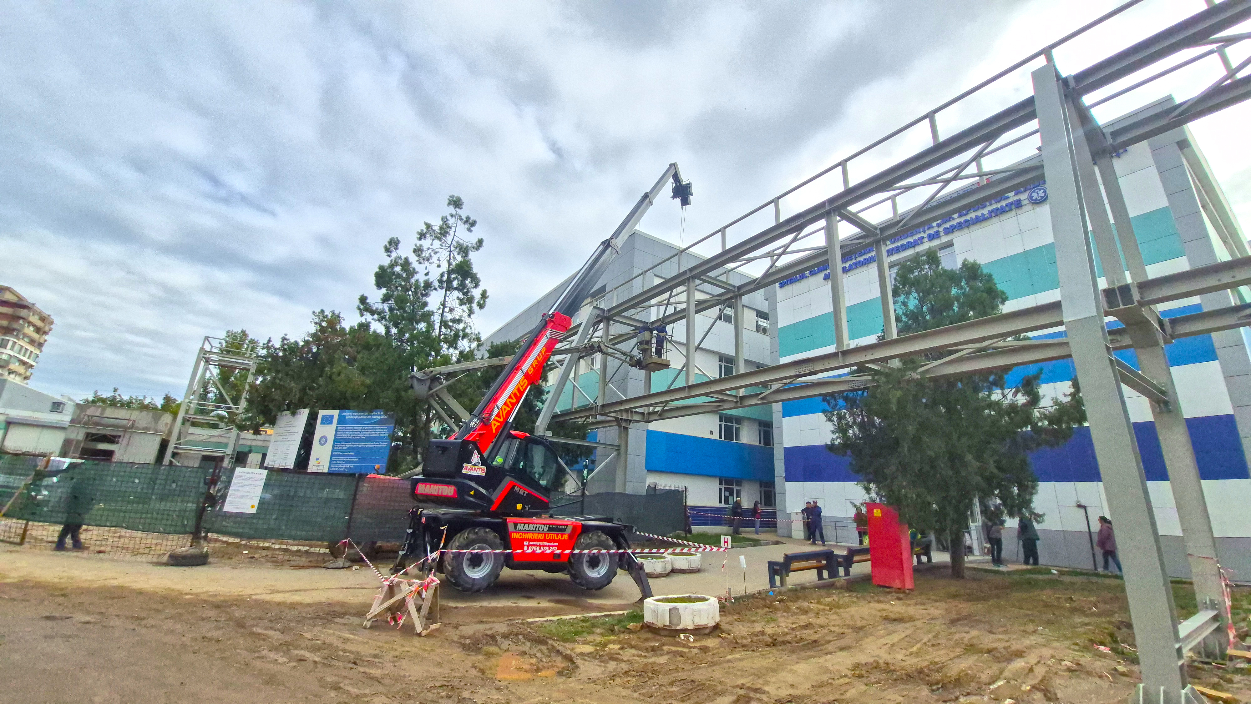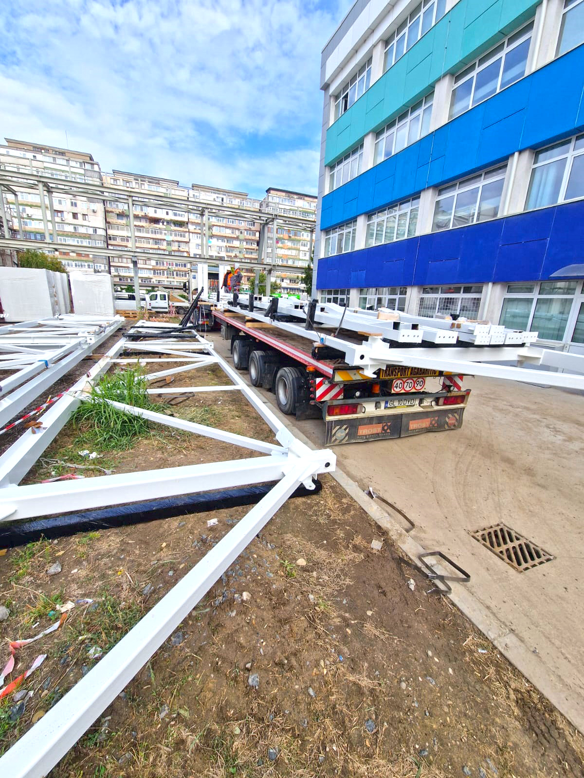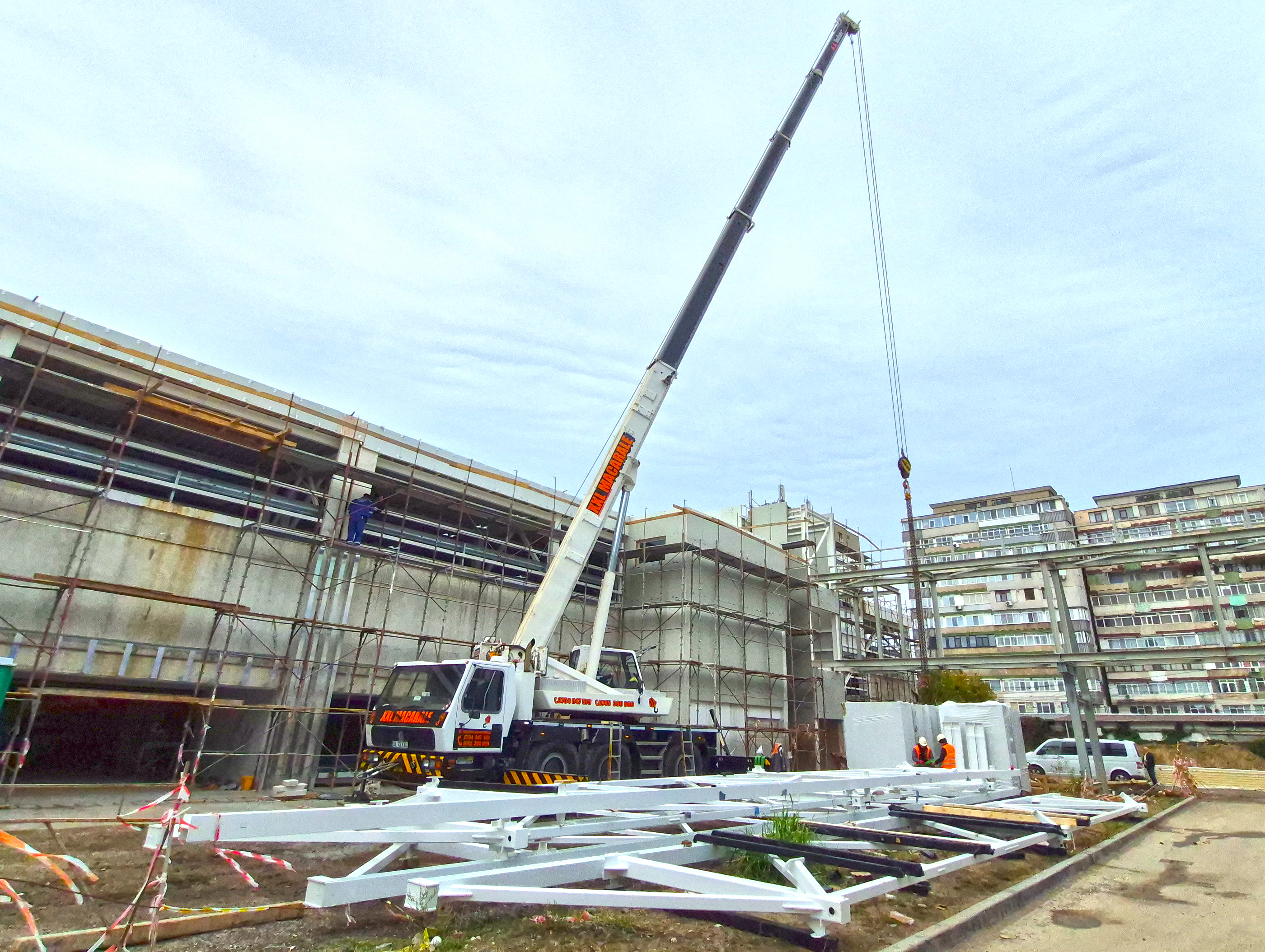 Pe șantierul parcării supraetajate de la Spitalul Județean din Galați au sosit și se montează elementele structurii de rezistență pentru heliportul SMURD, care va fi amplasat la ultimul nivel al clădirii.