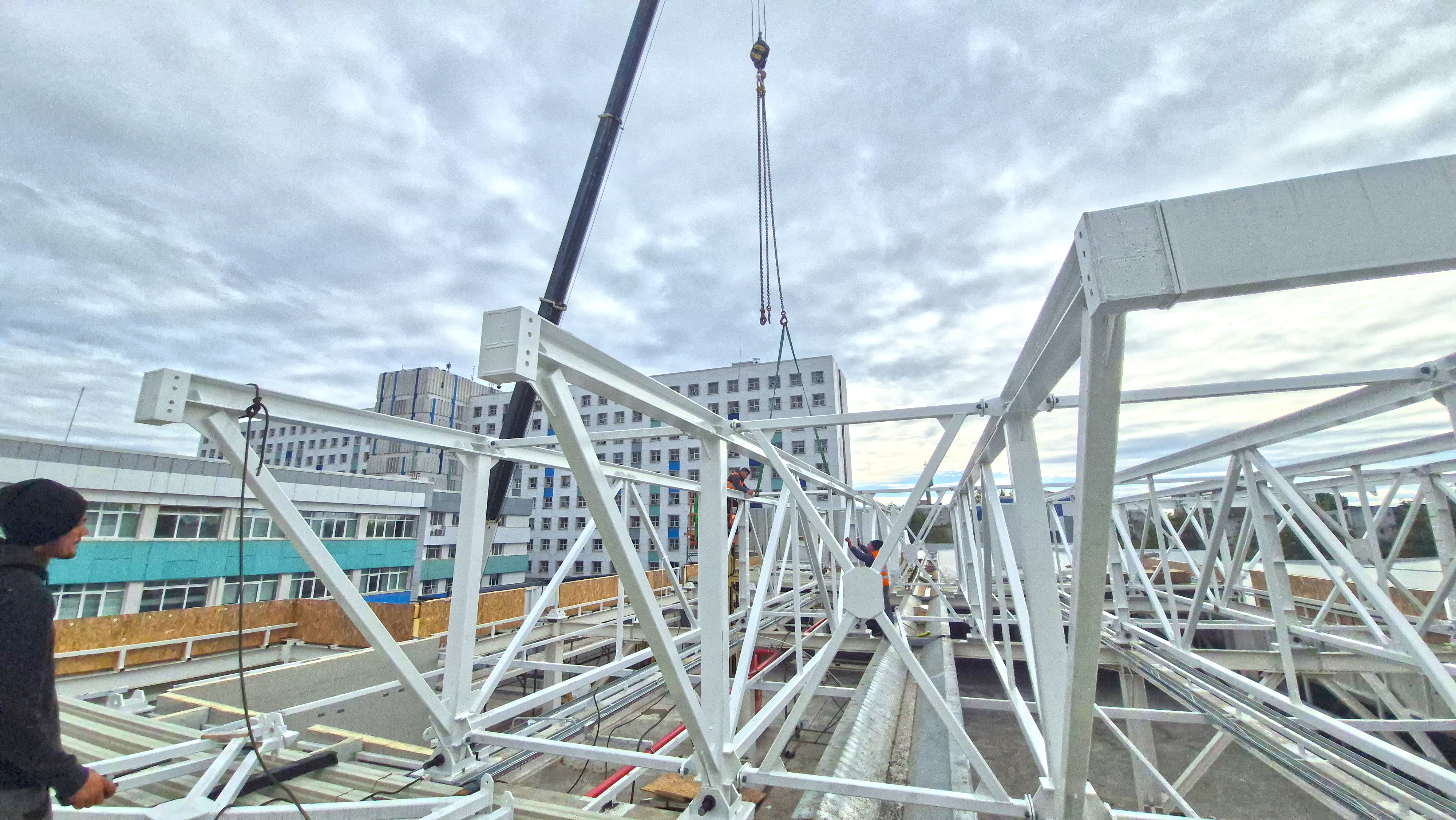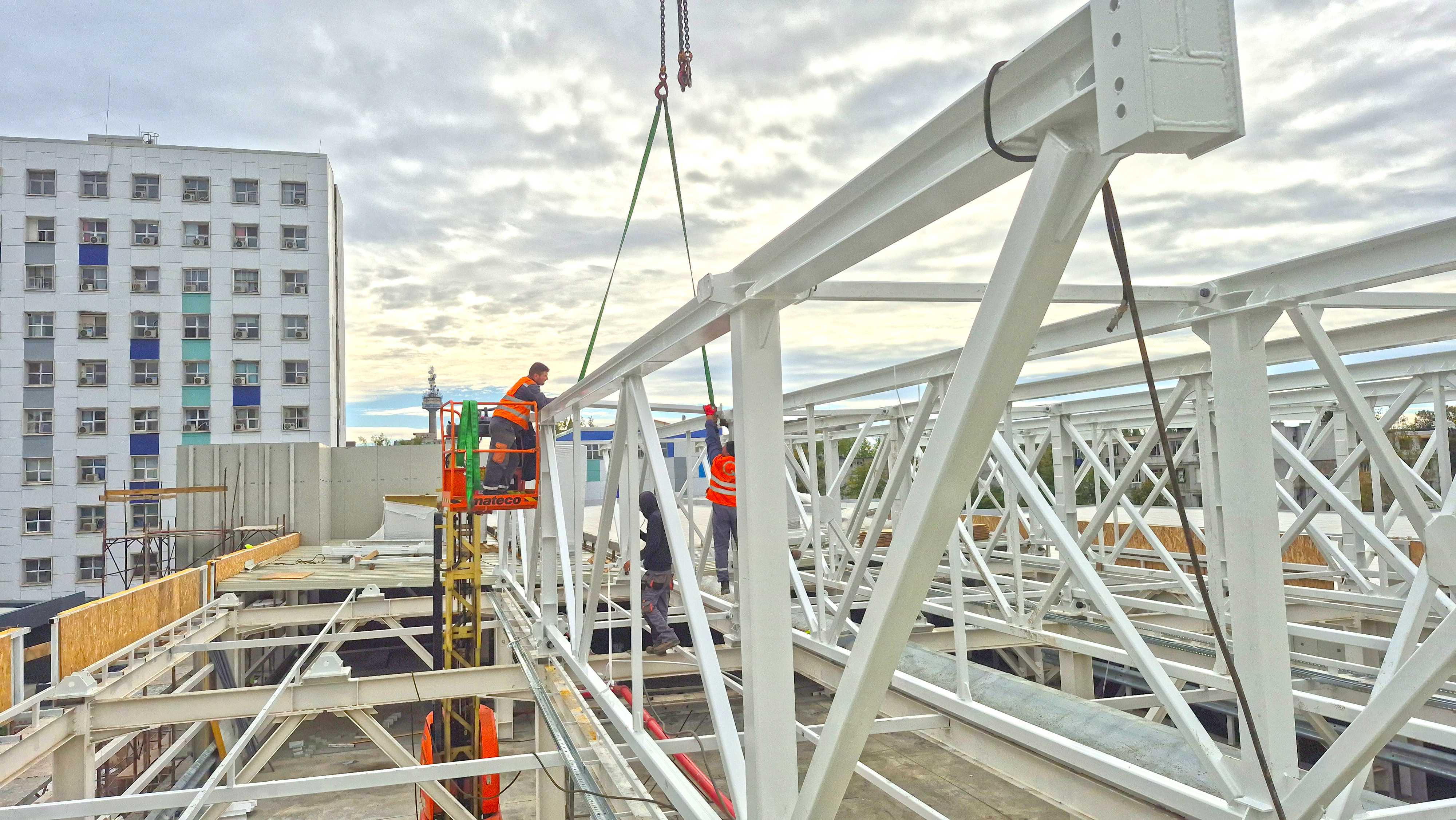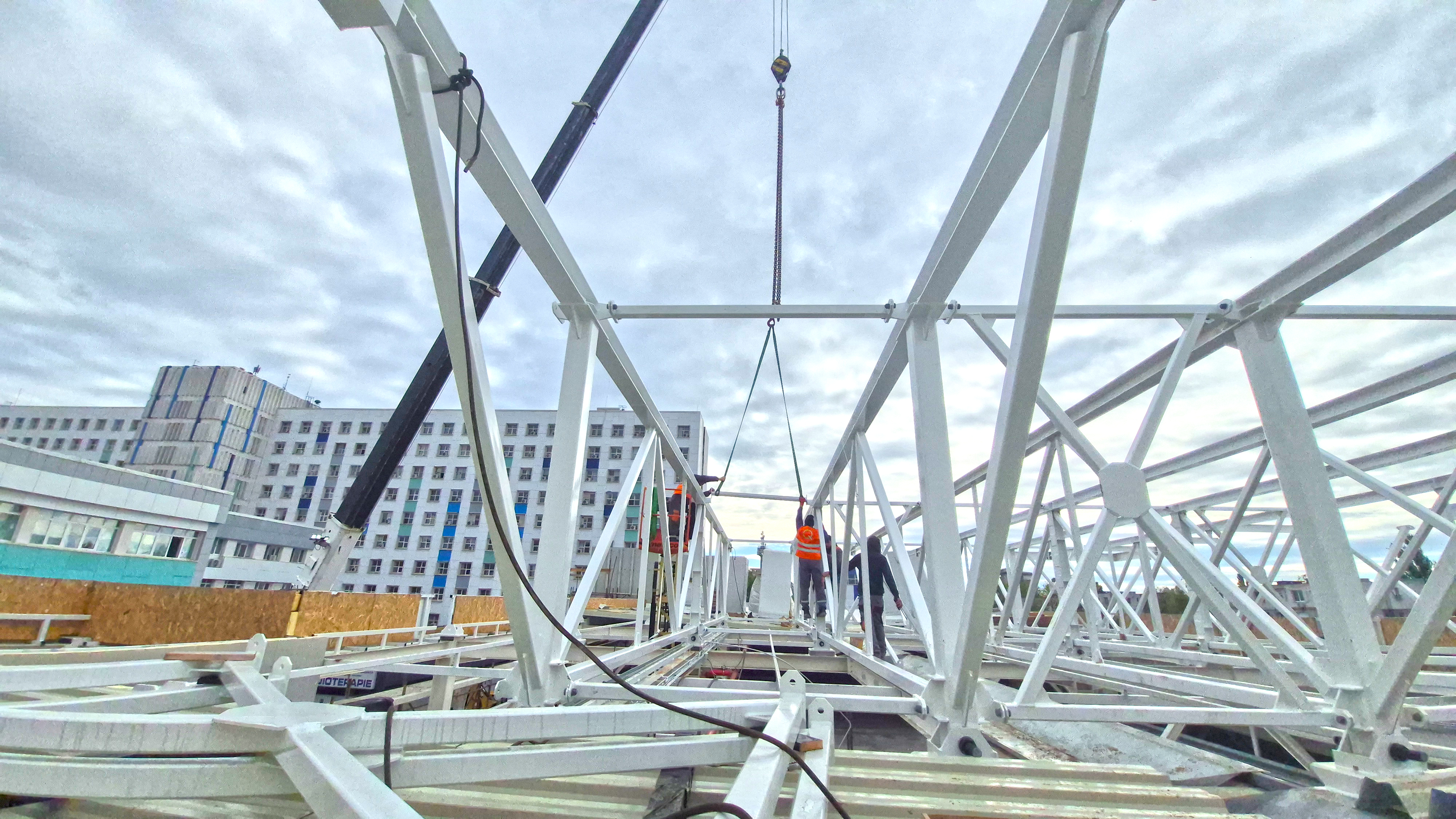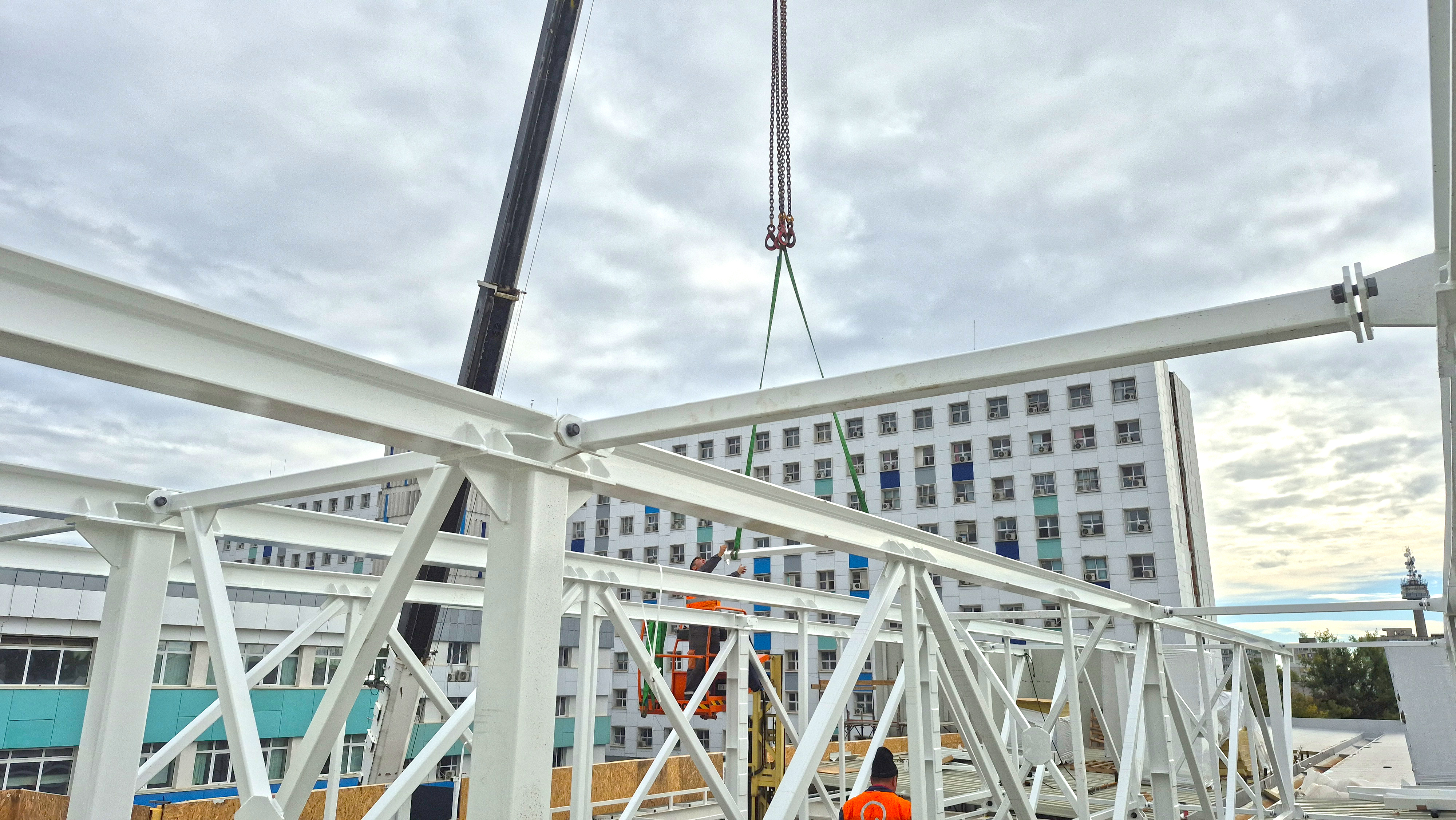 Pe șantierul parcării supraetajate de la Spitalul Județean din Galați au sosit și se montează elementele structurii de rezistență pentru heliportul SMURD, care va fi amplasat la ultimul nivel al clădirii.