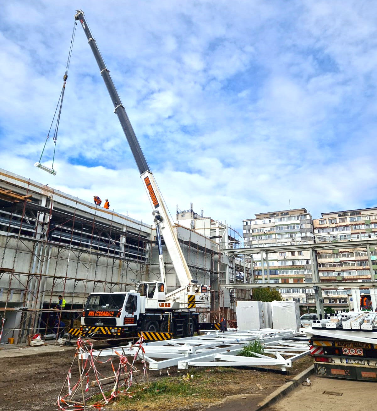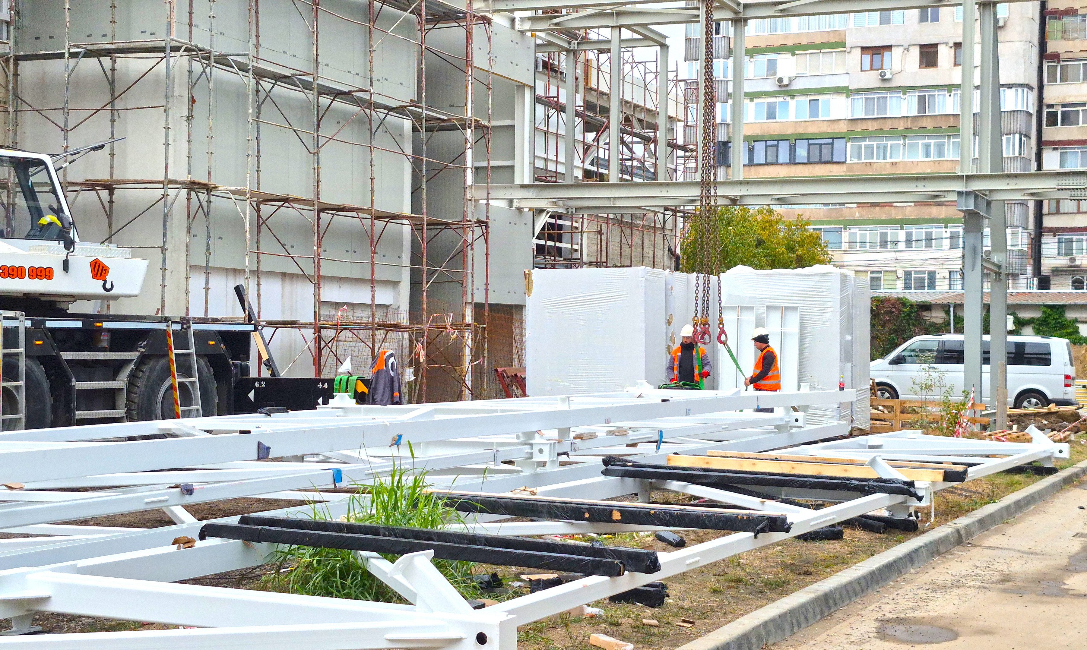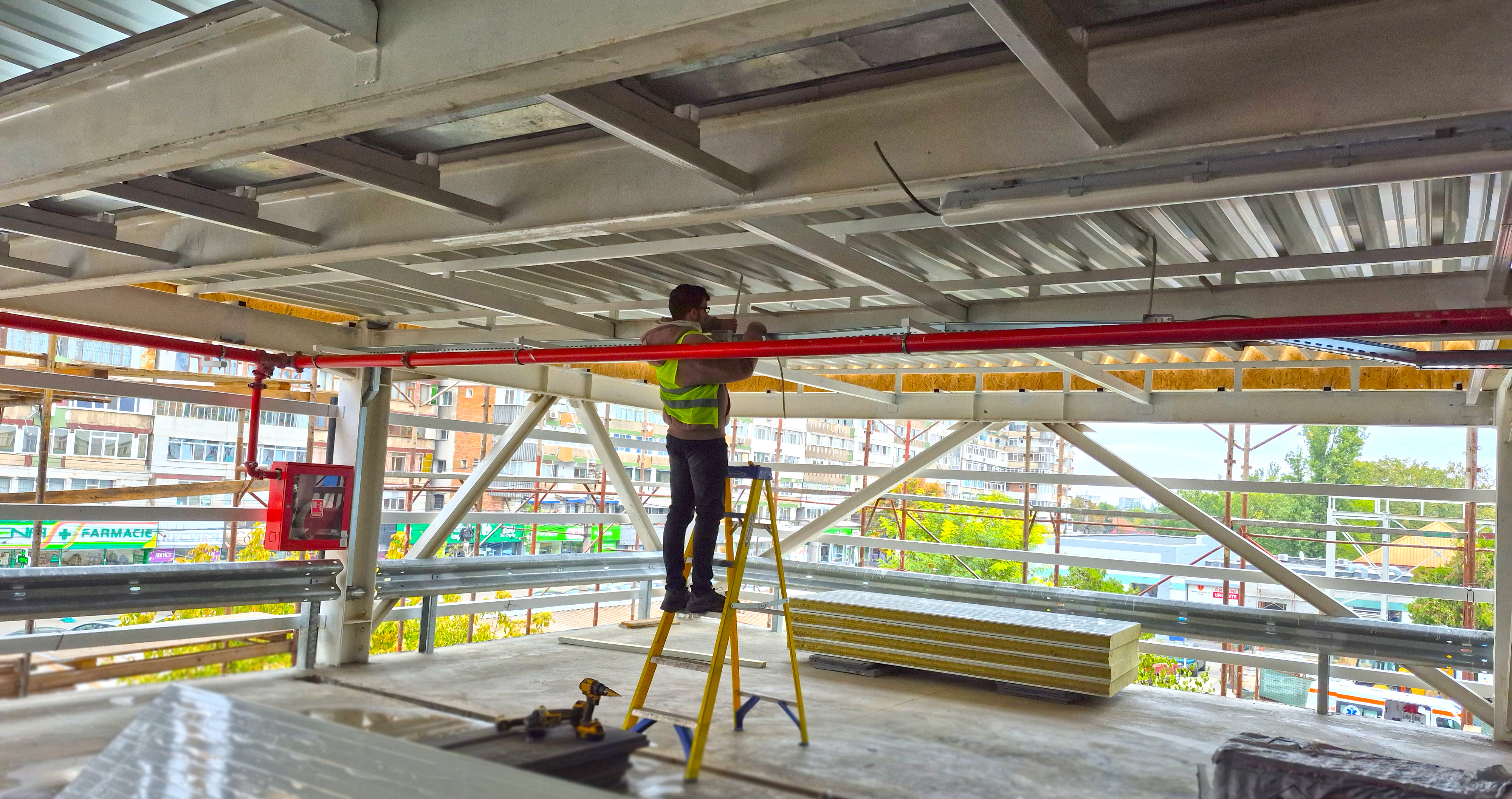 Constructorii mai desfășoară lucrări și la structura fațadei ventilate, o componentă importantă în asigurarea eficienței energetice și a aspectului modern al construcției.