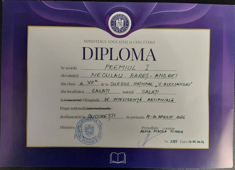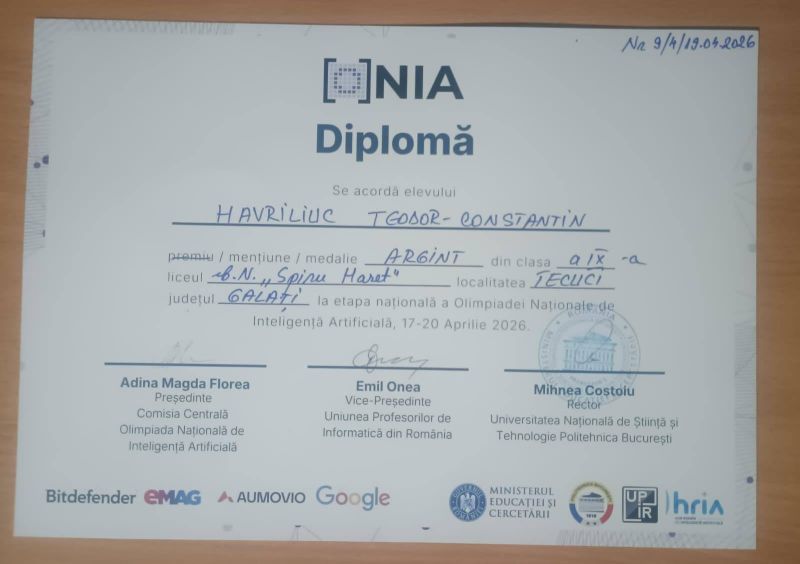 Elevii care au reprezentat cu succes județul Galați la etapa națională a Olimpiadei de Inteligență Artificială s-au întors de la București cu trei premii: