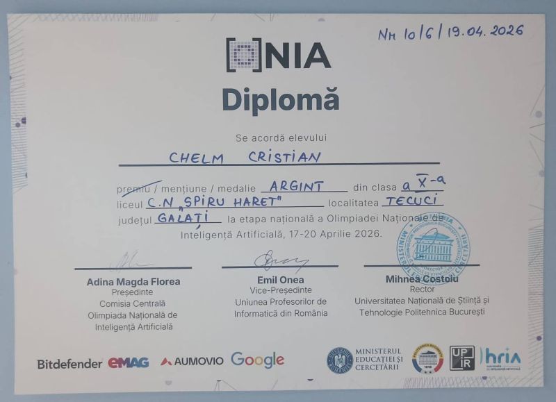 3. Cristian Chelm, Colegiul Național „Spiru Haret” Tecuci, clasa a X-a, profesor Robert Țopa: Mențiune și Medalie de argint.
