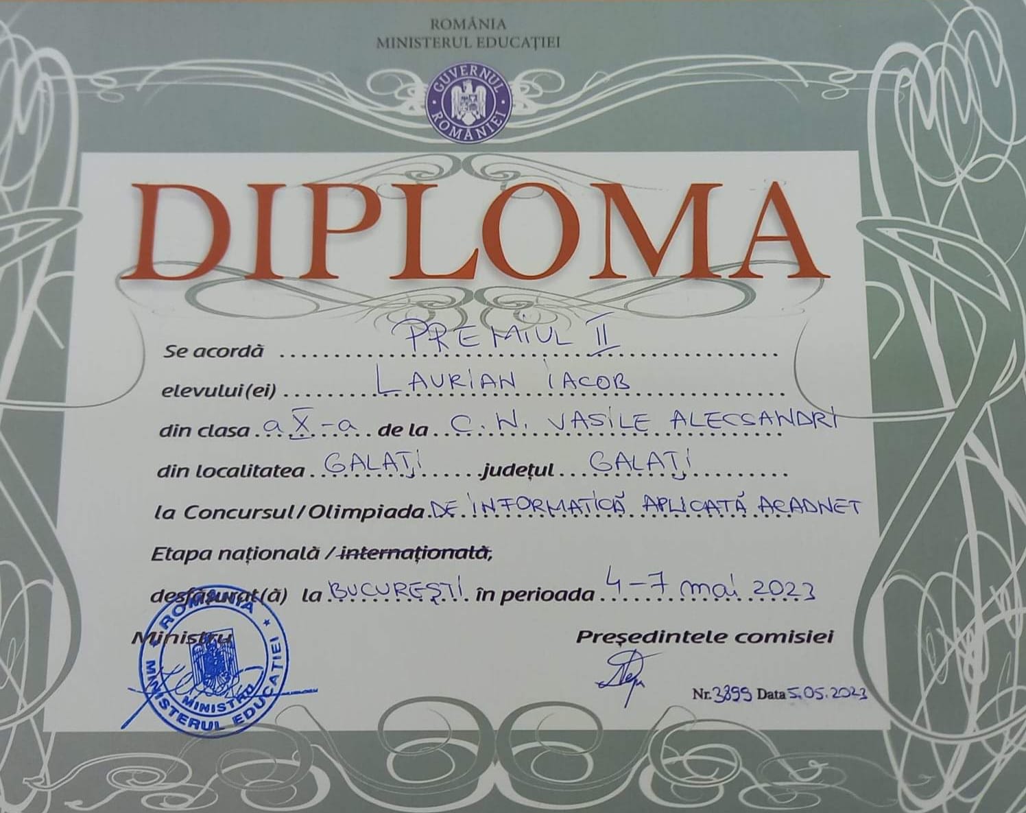 Lotul care a reprezentat Galaţiul la Olimpiada de Informatică aplicată - AcadNet, faza națională, desfășurată la Universitatea Politehnică București, s-a întors acasă cu două premii şi o menţiune. Toţi elevii care au obţinut distincţii la acest concurs sunt de la Colegiul Naţional "Vasile Alecsandri". Premiul I i-a fost acordat elevei Ioana Cristina Căpriță, în timp ce colegul ei Laurian Iacob a primit Premiul al II-lea. Mențiunea a fost câştigată de Ștefan Nicolas Bratoveanu.