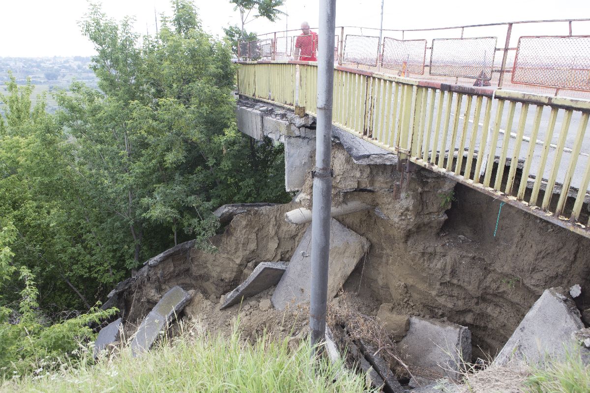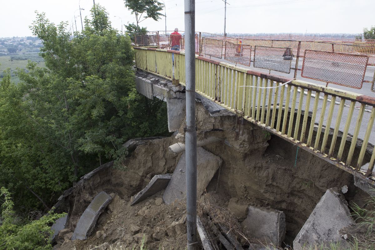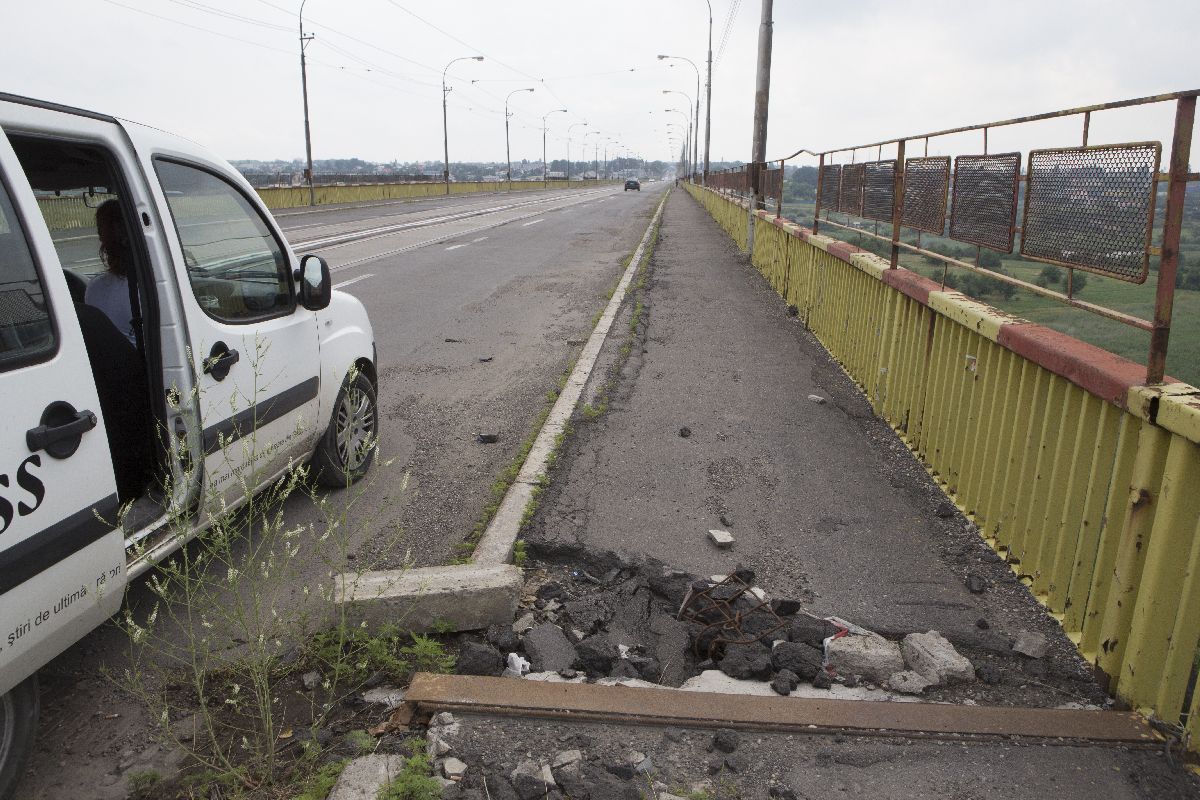 O construcţie simbolică pentru Galaţi şi până nu demult cel mai mare viaduct din ţară, podul care leagă oraşul de platforma siderurgică stă să se surpe din cauză şubrezirii structurii de rezistenţă, fenomen la care şi-au adus aportul deopotrivă factorii naturali, cât şi hoţii de fier vechi. Degradarea vizibilă a început de ani de zile, gardul metalic de protecţie, ciunţit în multe locuri, fiind un prim semnal de alarmă că circulaţia pe Viaduct devine tot mai periculoasă. Cârpirea parapetului a fost o soluţie temporară pentru ca într-un eventual eveniment rutier, vreo maşină sau pietoni să nu plonjeze în gol, de la peste 60 de metri. Adevăratul pericol vine însă din gropile care s-au format pe ambele margini ale viaductului şi care pot produce oricând o surpare. Cea mai mare este, de departe, gaura formată lângă un picior al podului la circa 100 de metri de intrarea pe platoforma siderurgică. Prin gaura căscată în trotuar, care măsoară circa cinci metri diametru se vede hăul de dedesubt, iar asfaltul, inclusiv linia de tramvai, sunt vizibil afectate de surpare. De altfel un fir al liniei ferate care trece prin zona respectivă fost îngrădit de Primărie, circulaţia rutieră pe porţiunea afectată desfăşurându-se, până ieri, cu restricţii.