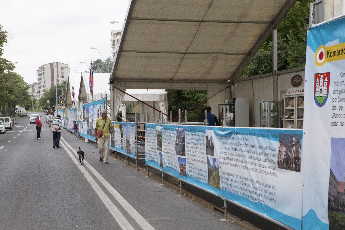 De-a lungul bannerului, care serveşte şi de paravan şi de gărduţ, sunt amplasate zece corturi pentru fiecare dintre ţările dunărene. Organizatorii promiseseră că vom găsi în corturi, pe lângă cărţi ale unor autori din ţările dunărene, pliante cu informaţii turistice, şi mini-târguri de produse tradiţionale specifice statelor dunărene. În realitate, însă în cortul Germaniei găsim doar bere nemţească, în cortul Austriei – dulciuri din Tulcea, în cel al Bulgariei – dulciuri din Oradea, baclava şi cafea turcească, iar în cortul Slovaciei - acadele, covrigi pe sfoară şi turtă dulce de la Piteşti. Tot respectul pentru brânza de Sibiu, afumăturile de Bacău sau pastrama de Vrancea-Odobeşti, dar Dunărea nu trece prin aceste zone! În schimb, Tulcea e prezentă cu hamsii, mici, pui, cârnaţi şi ceafă de porc perpelite pe grătar şi stinse cu vin de Măcin.