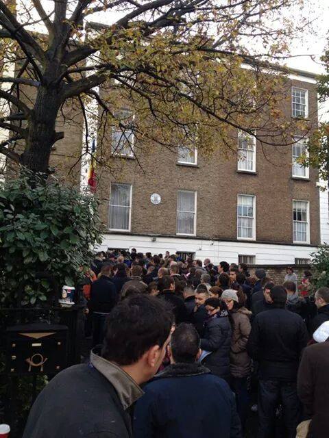 „Erau deja peste 40-50 de români când am ajuns, 6 fără 20", ne-a declarat Paula. La deschiderea ușilor secției se adunaseră peste 250. Ambasadorul însuși stătea la coadă, era cam al 200-lea.”