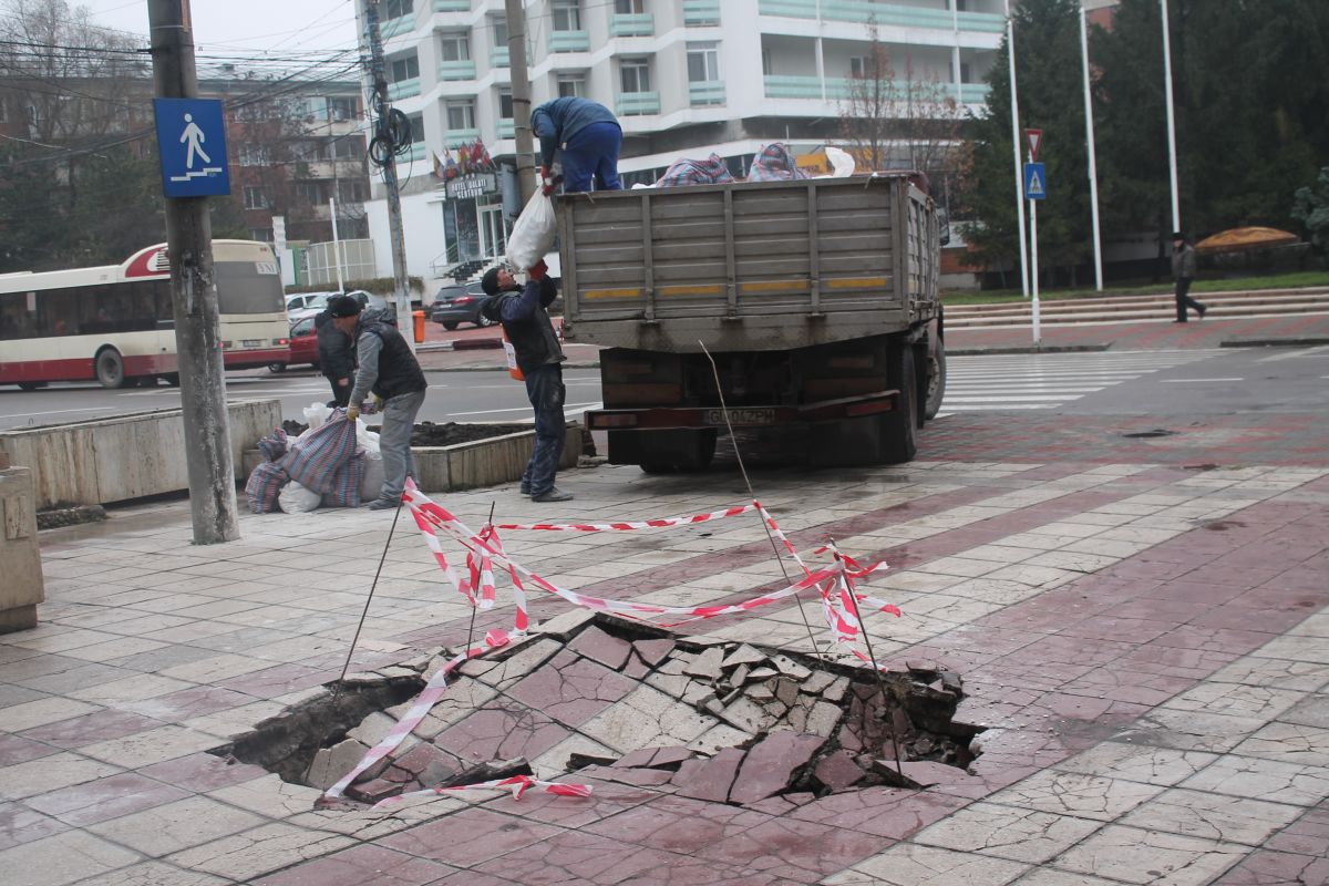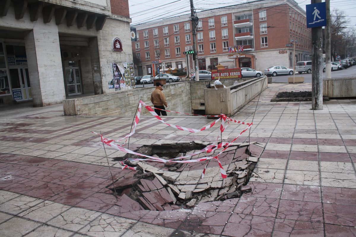 Esplanada din faţa pasajului din centru a cedat, joi, în jurul orei 12.00, creându-se o nouă groapă.