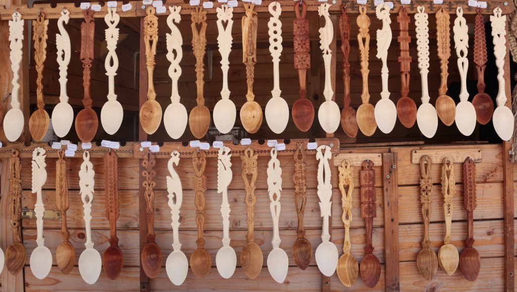 Alături, îşi are standul domnul Viorel Marian. E sculptor în lemn. A lucrat 17 ani la o fabrică de cherestea, apoi a făcut mobilă şi, în cele din urmă, a decis să plece pe cont propriu, în artizanat. „Eu sunt unul dintre cei care îşi poate întreţine familia – la limită, ce-i drept! – din ceea ce fac. Îmi place meseria mea şi lucrez, în fiecare zi, măcar zece ore. Nu-i uşor. Fac, din plop şi cireş, de la linguri, la casete şi icoane. Am un atelier mic”, ne spune meşterul din Suceava.