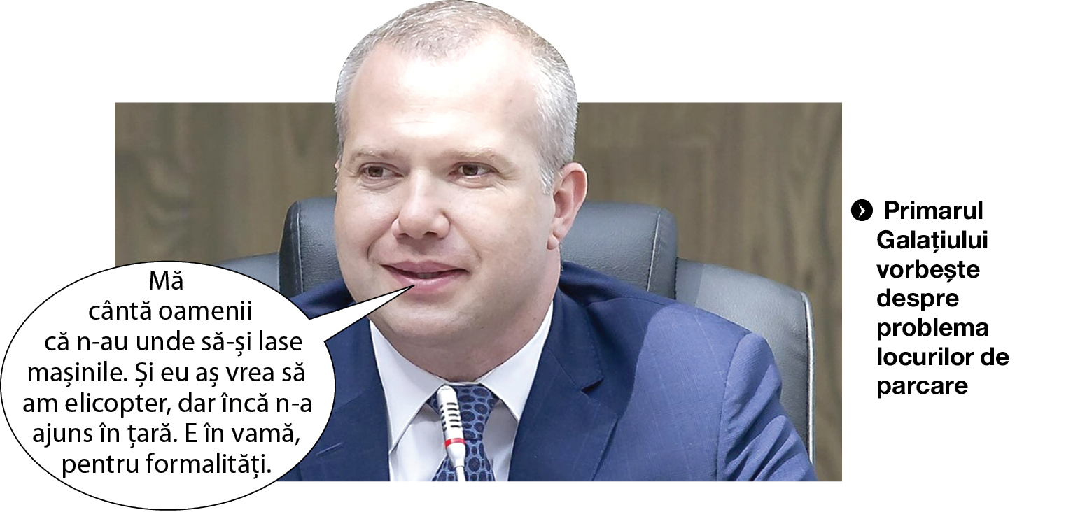 * Primarul Ionuț Pucheanu și-a propus pentru anul deja în curs ca posesorii de autoturisme din Galați să parcheze și în extravilan. "De unde să mai scot parcări? Doar nu aduc parcări de la mama. Am făcut licitații, 10-20 la sută dintre proprietarii de mașini vor avea unde să parcheze, dar celorlalți n-am ce să le fac. La Brăila au încercat să și le lase? E doar 15 lei biletul până la noi în oraș, pe dig, nu-i mare brânză", a comentat șeful municipalității gălățene.