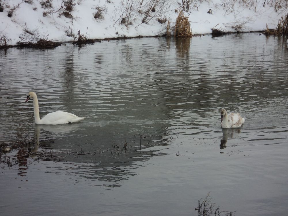 Coborâte parcă din povestea lui Hans Christian Andersen, câteva lebede fac spectacol în comuna gălăţeană Iveşti. De câteva zile, superbele păsări - unele albe, altele cu penele în schimbare, semn că sunt foarte tinere - au poposit pe apa râului Bârlad, cursul său inferior (albia veche), care străbate localitatea. Răsfăţate cu firimituri de pâine de către iveşteni, lebedele nu se tem de copiii care, la câţiva metri distanţă, au transformat apa îngheţată într-un patinoar în aer liber.
