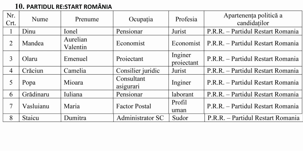 Lista este deschisă de Viorica Gotu, de profesie psiholog, expert judeţean pentru romi în cadrul Instituţiei Prefectului Judeţului Galaţi. Următorii candidaţi sunt: Manuela Marieta Beteringhe (profesie - manager relaţii financiare, ocupaţie - director vânzări), Claudia Zamfir (inginer, consultant financiar), Dorina Grecu (electromecanic, casnică) şi Vasile Cobzaru (lăcătuş, manager).