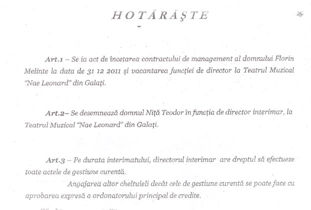 Florin Melinte pretinde că este director al teatrului în continuare deoarece, conform contractului de management, primarul şi Consiliul Local trebuia să ia act, după demisie, de vacanţa postului şi să numească un interimar. În contractul de management pe care l-a avut Florin Melinte se arată negru pe alb „Contractul încetează prin renunţarea de către manager la mandatul încredinţat; în acest caz managerul va acorda un preaviz de cel puţin 30 de zile”. Iar în facsimil puteţi citi demisia lui Florin Melinte. Primul articol al hotărârii votate recent de aleşi prevede clar: „Se ia act de încetarea contractului de management al domnului Florin Melinte la date de 31.12.2011 şi vacantarea funcţiei de director la Teatrul Muzical Nae Leonard din Galaţi”. În articolul al doilea Teodor Niţă este desemnat în funcţia de director interimar iar în cel de-al treilea articol i se dă dreptul să efectueze toate actele de gestiune curentă.
