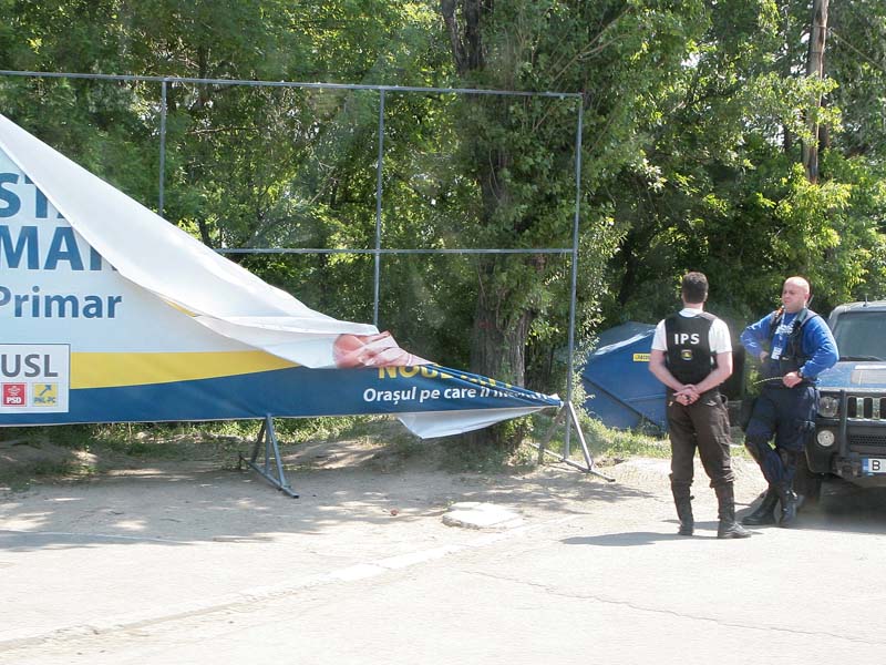 Unul dintre prea multele panouri, instalate fără autorizaţie, şi al cărui proprietar nu a fost identificat de Poliţie, a înclinat steagul, şi abia mai stă într-o rână gata să pună la pământ câteva tufe de trandafiri şi un copăcel, nevinovate victime colaterale.