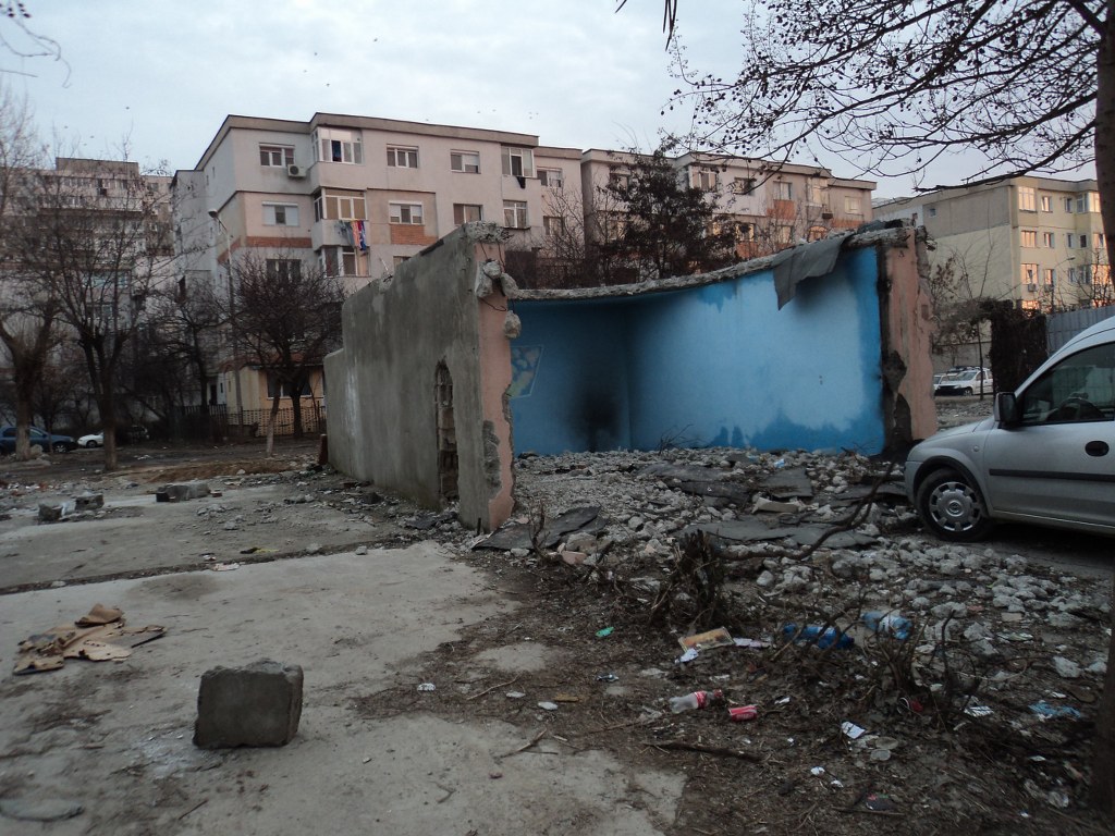 Cu ziduri groase de cetate, un garaj albastru infinit, din care au mai rămas doar trei pereţi fără acoperiş, sfidează mizeria din jur cu picturile pastelate din interior. Ruine, cărămizi, resturi de construcţie, noroi, pereţi sau bucăţi de garaj care încă se mai ţin în picioare, gropi, fundaţii trainice, demne de o cazemată, şi maşini parcate pe unde s-a putut în toată această mizerie. Nu e Complexul Ancora, aşa cum aţi putea crede, ci terenul din zona blocurilor L12, D9A şi D8A (la parterul căruia se află şi Grădiniţa „Ileana Cosânzeana”).