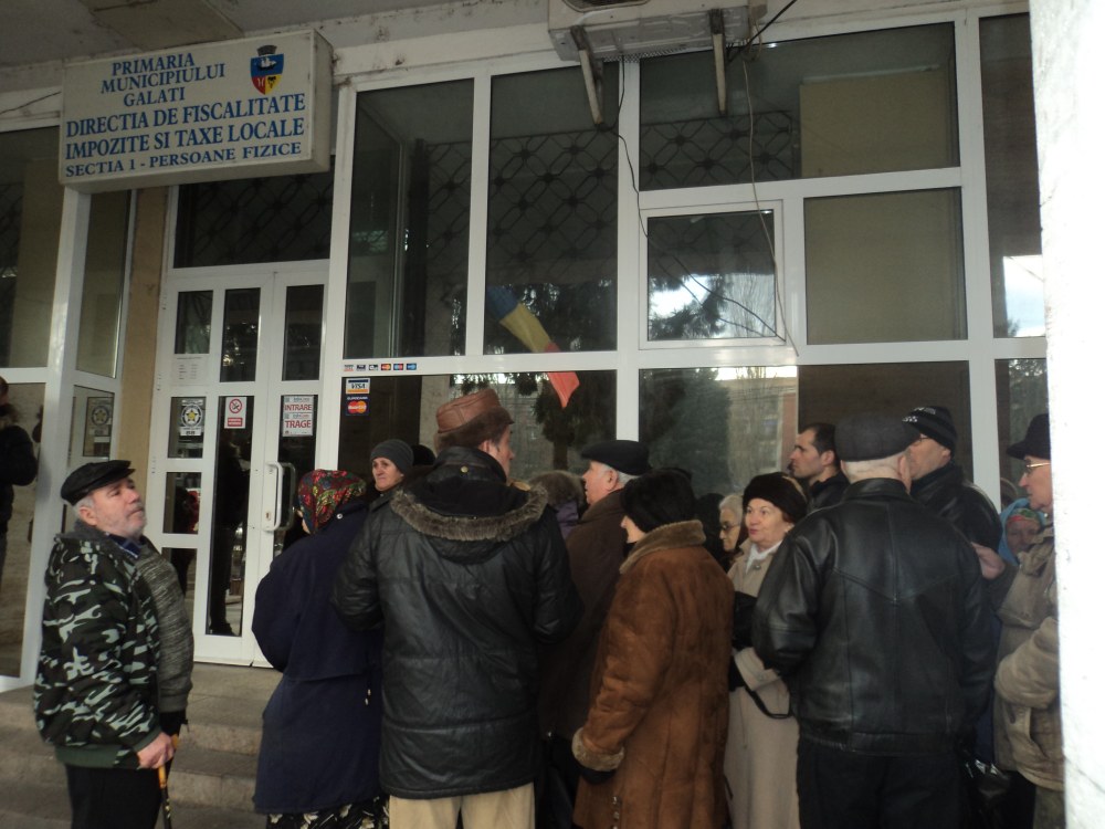 Zeci de gălăţeni, în majoritate pensionari, s-au sculat luni cu noaptea-n cap şi s-au încolonat la uşa Direcţiei de Fiscalitate de la Romarta Veche, aşteptând să se deschidă pentru a-şi plăti impozitele locale. De altfel, coada face parte din „tradiţiile” primei zile în care se încasează obligaţiile fiscale. Aşa se face că, pe la 8,20, cu zece minute înainte de începerea programului cu publicul, rândul format depăşea lungimea sediului fiscalităţii.