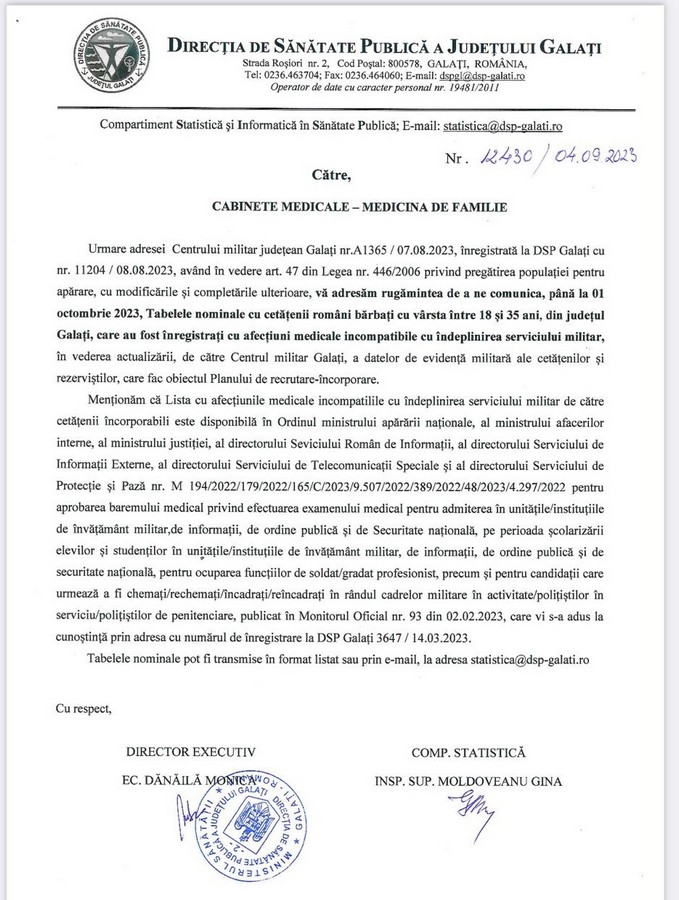 1 octombrie este data-limită până la care medicii de familie trebuie să transmită Direcției de Sănătate Publică listele cu pacienții aflați, din punct de vedere medical, în incompatibilitate cu stagiul militar. Asta presupune că toți medicii care au în evidență pacienți bărbați, cu vârste cuprinse între 18 și 35 de ani, adică acea categorie care poate fi chemată pentru recrutare și/sau încorporare conform legii, de către centrele militare, trebuie să comunice, nominal, problemele care îi fac pe aceștia inapți. Lista afecțiunilor, necesară, potrivit CMJ Galați, actualizării datelor de evidență militară ale cetățenilor și rezerviștilor care fac obiectul Planului de recrutare-încorporare, este una lungă și vizează un spectru larg, de la boli ale sistemului circulator, la cele psihice.