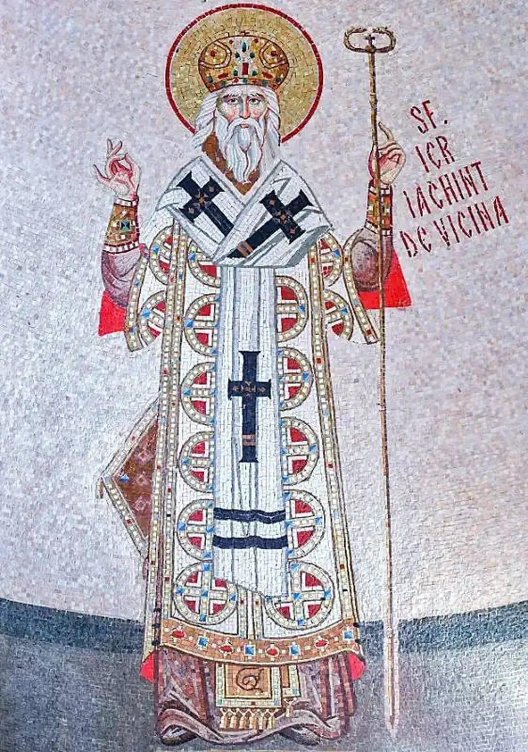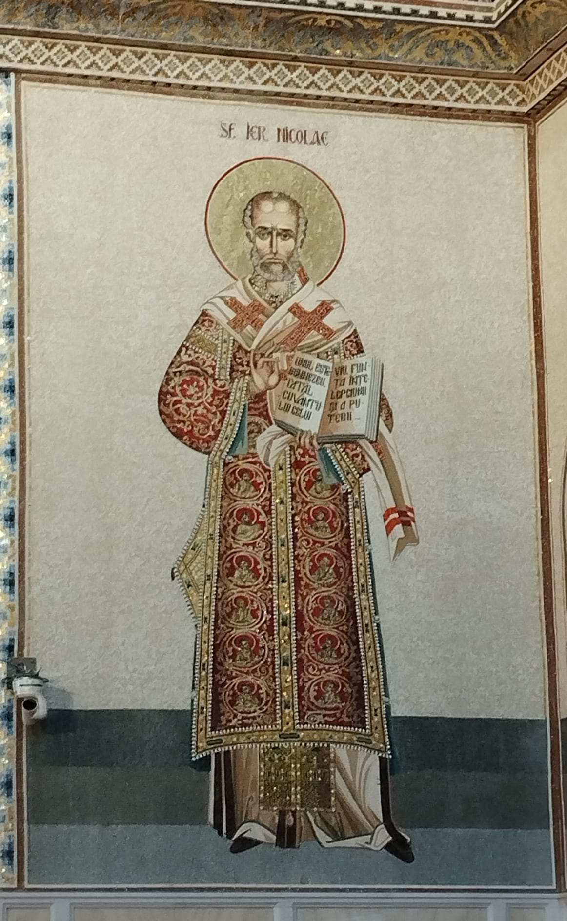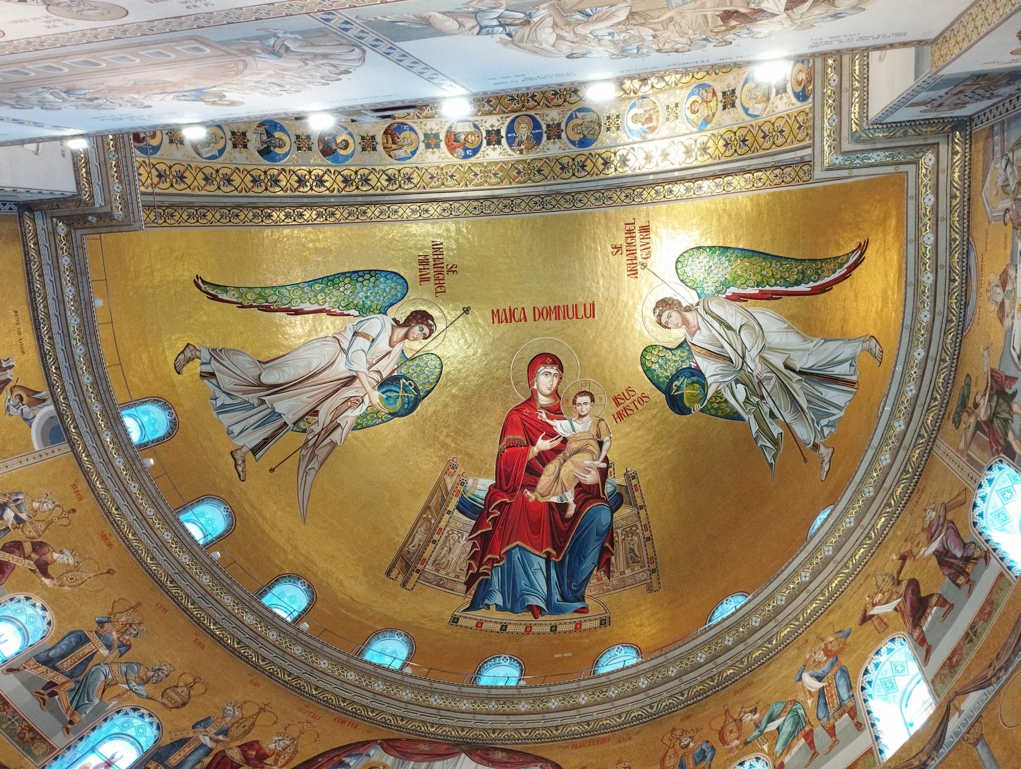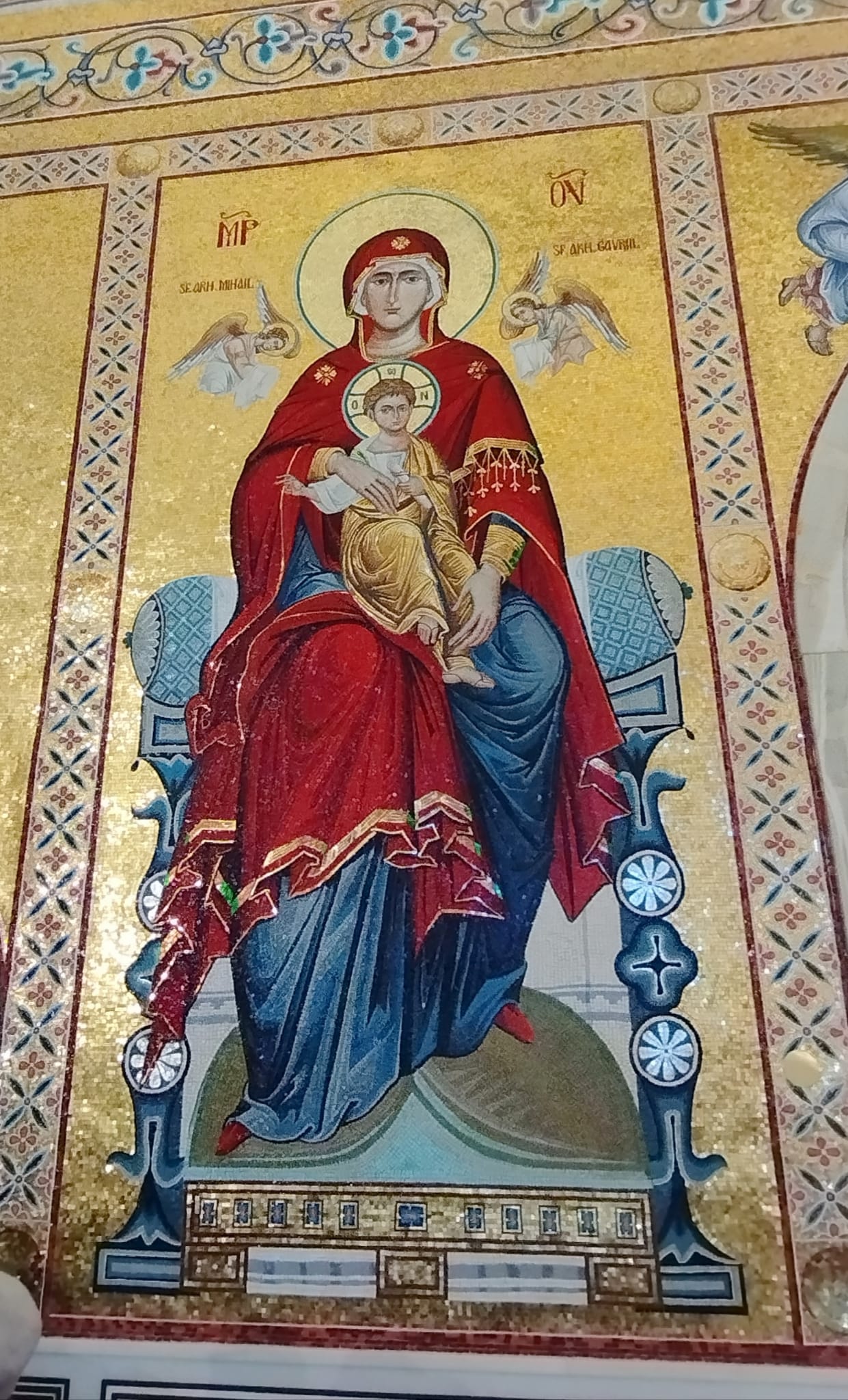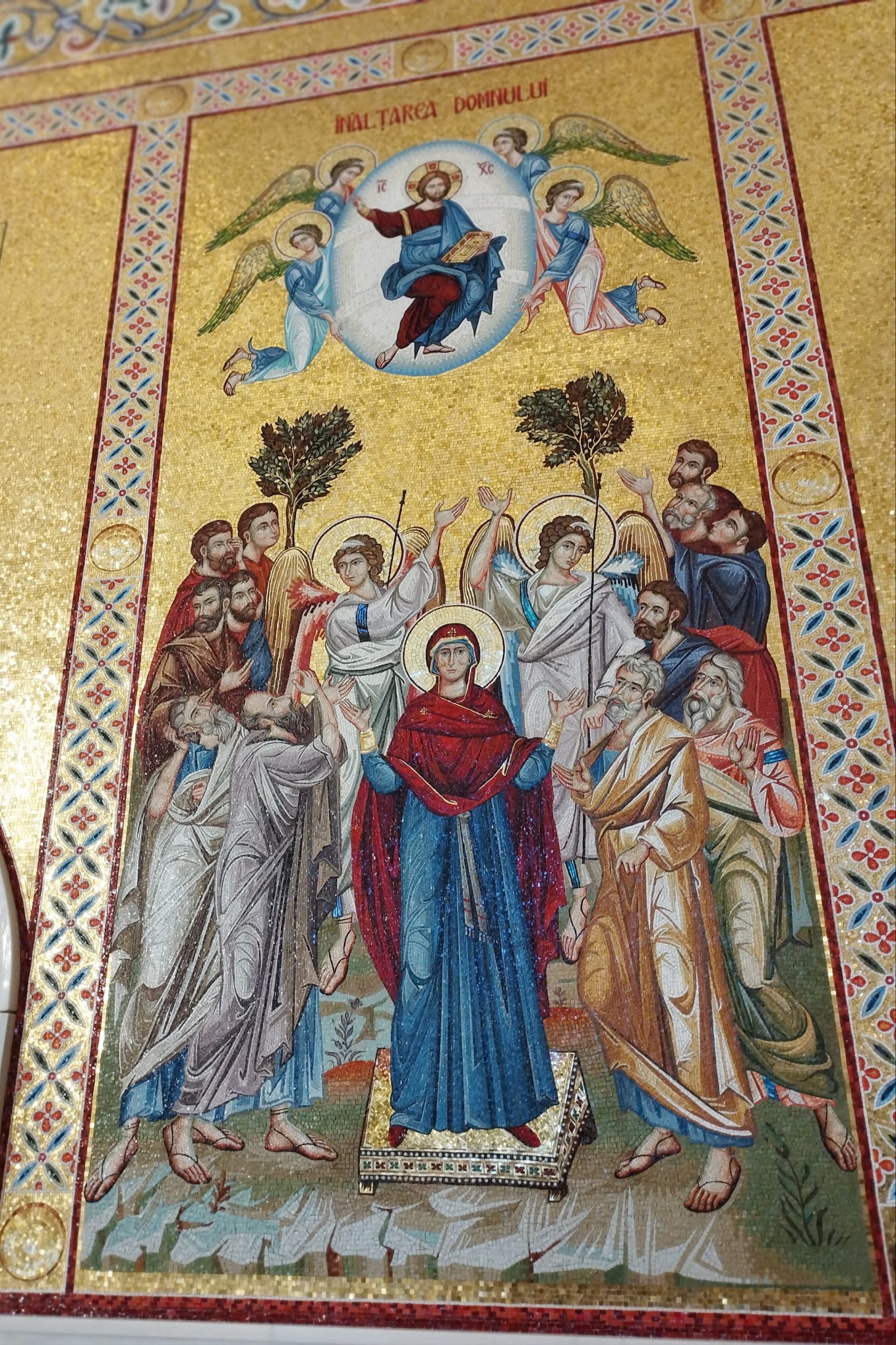 Alături de Maica Vieții sunt reprezentați Sfinții Arhangheli Mihail și Gavriil. Pe un metru pătrat, se unesc în armonie 10.000 de pietricele-tesere fabricate în atelierele Orsoni din Veneţia și Carrara, dar s-a lucrat și cu sticlă de Murano.