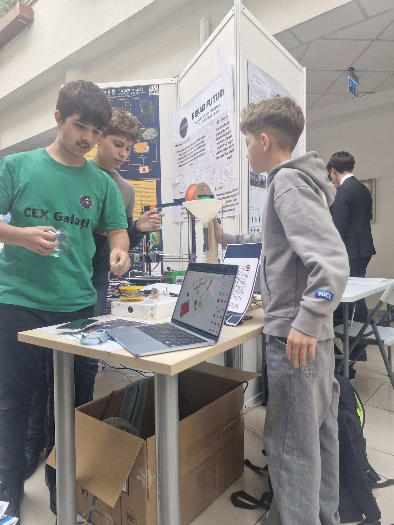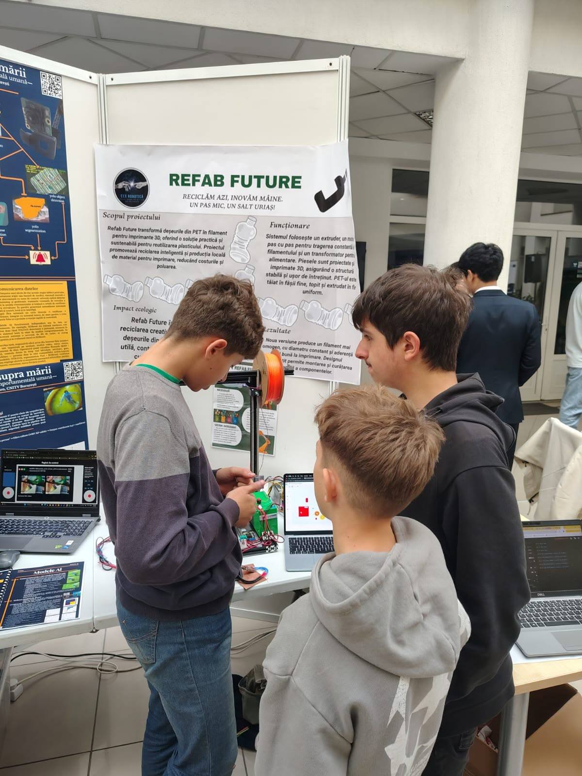 Echipa 1, formată din Ioan Jianu, clasa a IX-a, Liceul cu Program Sportiv Galați, Cosmin Bratu, clasa a VIII-a, Școala Gimnazială „M. Costin”, şi Dorin Frumuzache, clasa a VII-a, Colegiul Național „M. Kogălniceanu”, a participat la secţiunea Științe Aplicate - Seniori, proiectul lor fiind referitor la reciclarea deșeurilor plastice și transformarea lor în filament pentru imprimante 3D. Elevii au creat un sistem funcțional prin care resturile de plastic și bucățile de P.L.A. rezultate din imprimarea 3D sunt topite, extrudate și transformate în filament reutilizabil, un proiect cu impact ecologic major și aplicabilitate imediată în domeniul tehnologiei.
