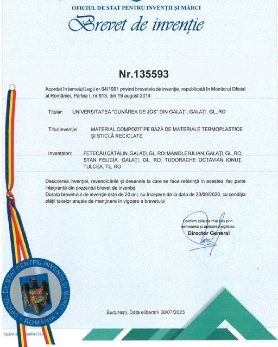 Invenția aparține cercetătorilor prof. univ. dr. ing. Cătălin Fetecău, ing. Iulian Manole și prof. univ. dr. ing. Felicia Stan, din Galați, și lui Ionuț Tudorache, din Tulcea, care activează sub egida Universității „Dunărea de Jos” din Galați. Cei patru au depus în 2022 cererea de brevet pentru acest material compozit pe bază de plastic și sticlă reciclate.