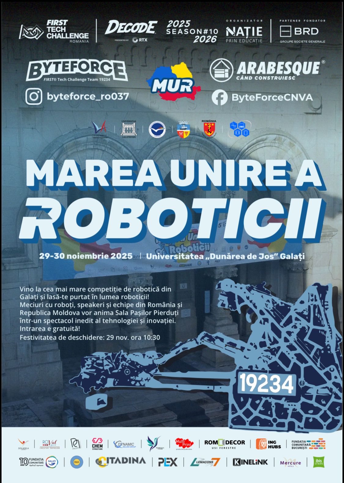 În perioada 29-30 noiembrie 2025, începând de la ora 10,30, Clubul de Robotică ByteForce al Colegiului Național „Vasile Alecsandri” din Galați, în colaborare cu Universitatea „Dunărea de Jos” din Galați, organizează cea de-a III-a ediție a evenimentului „Marea Unire a Roboticii”.