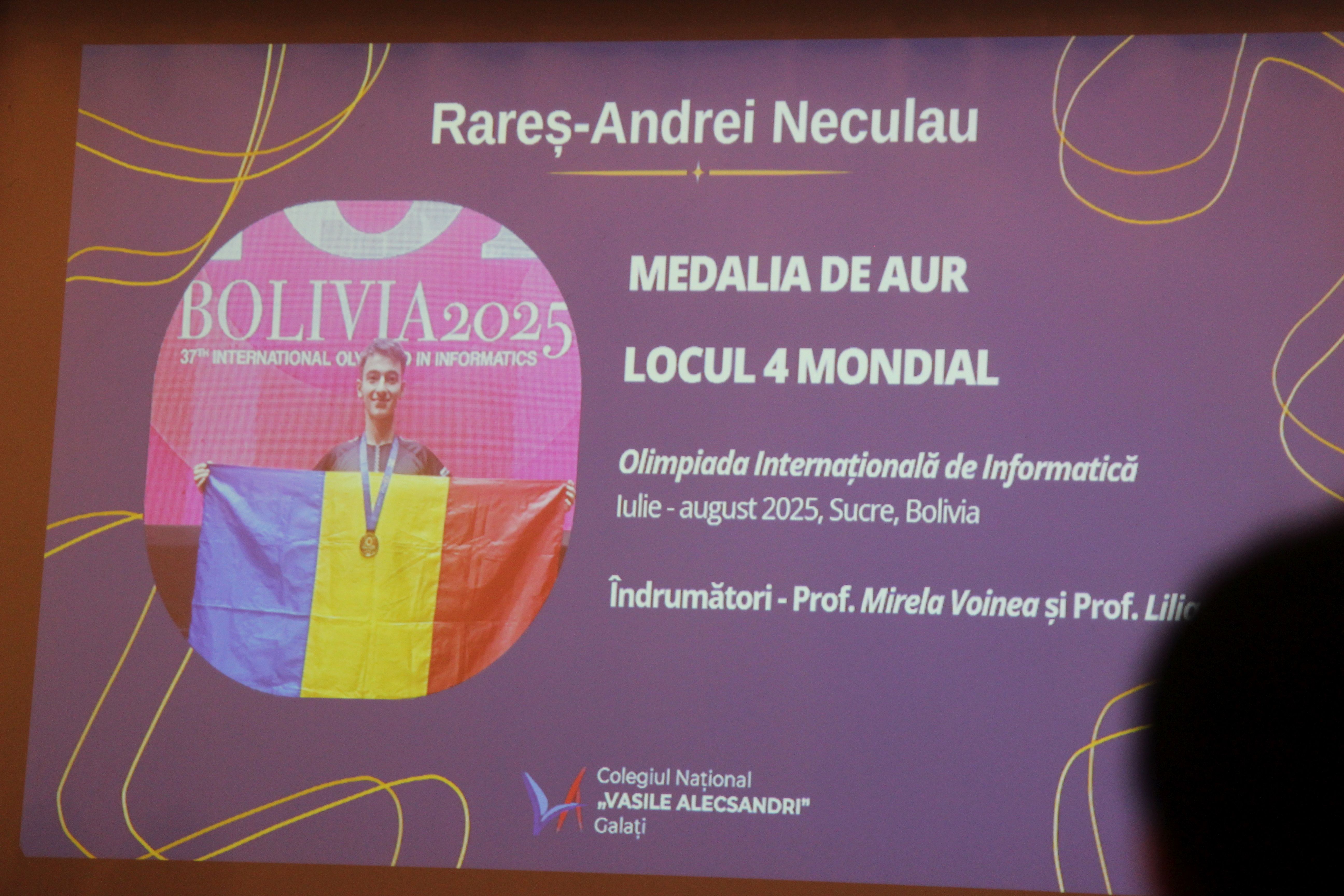 Unul dintre elevii care au primit aprecieri din partea întregului colectiv de profesori este Rareș Andrei Neculau, component al lotului României la olimpiada de informatică. Acesta nu se află în țară, deoarece reprezintă România la un concurs internațional. A transmis însă un mesaj video, în care și-a exprimat admirația față de toți profesorii săi și a transmis "La mulți ani!" colegiului unde este încă elev, în clasa a XII-a.