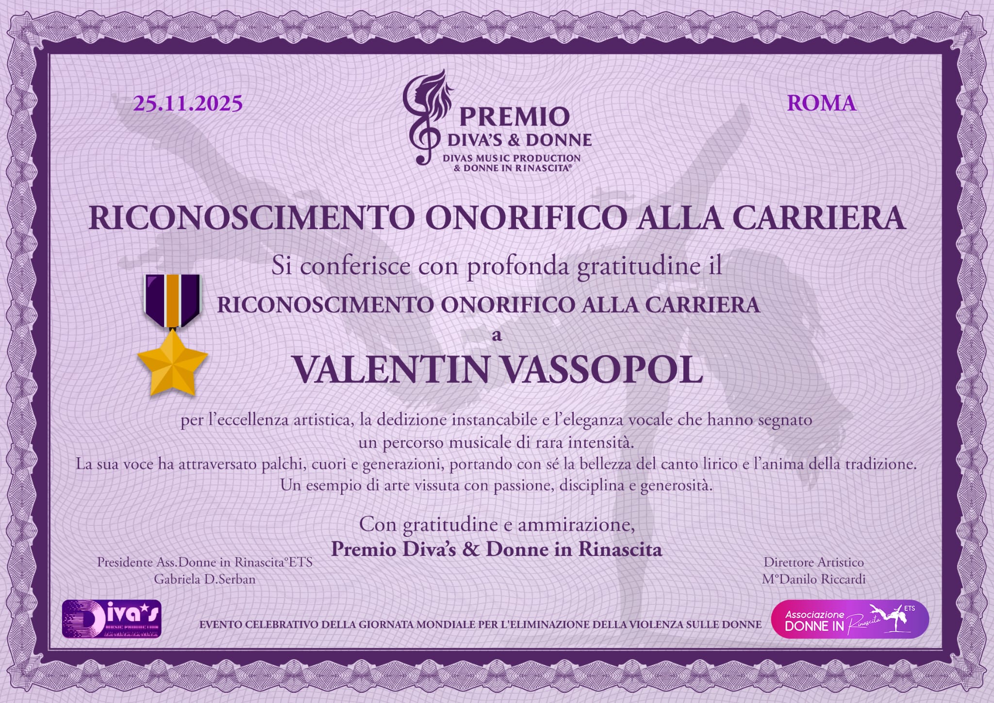 În cadrul aceluiași eveniment, Valentin Vasopol a fost distins cu „Riconoscimento Onorifico alla Carriera”, premiu onorific pentru excelență artistică, eleganță vocală și contribuția la promovarea artei lirice pe scene naționale și internaționale. Diploma a fost acordată în semn de admirație pentru o carieră dedicată muzicii, disciplinei și formării noilor generații de interpreți.