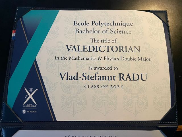 - Mă numesc Radu Vlad-Ștefănuț. Fost elev al CNVA, acum sunt student în anul 1 de Master la École Normale Supérieure (ENS), în Paris. Studiile de licență le-am făcut tot în Paris, dar la École Polytechnique, parte a Institutului Politehnic din Paris, unde am studiat matematică, fizică și chimie, în cadrul programului Bachelor of Science, unde mi-a fost acordată și o bursă de excelență. Vara trecută, am absolvit École Polytechnique ca șef de promoție, cu ”summa cum laude„, cea mai mare distincție. Dorind ca pe mai departe să fac cercetare, am fost admis în cadrul programului de PhD Track al ENS, cu bursă de excelență, program care îmi asigură atât cei doi ani de Master, cât și cei trei ani de Doctorat.