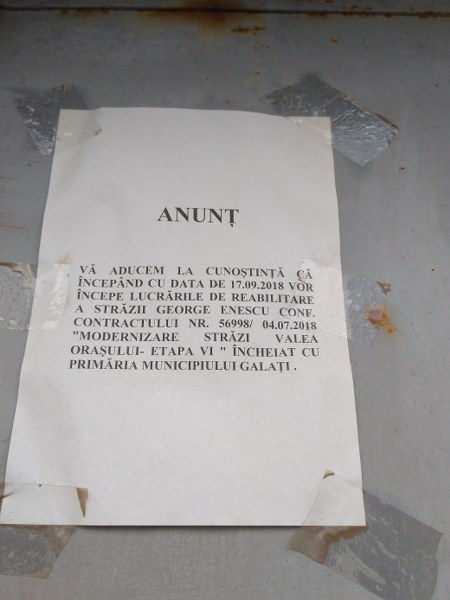 Pe gardul metalic al unei case am remarcat un anunţ lipit cu scotch: „Vă aducem la cunoştinţă că începând cu data de 17 septembrie 2018 vor începe lucrările de reabilitare a străzii George Enescu, conform contractului «Modernizare străzi Valea Oraşului - etapa VI» încheiat cu Primăria municipiului Galaţi”. Că în scriptele Primăriei strada se numeşte „George Enescu”, iar pe tăbliţele indicatoare de pe porţile locuitorilor scrie „strada Al. I. Cuza”, e o absurdă treabă birocratică.