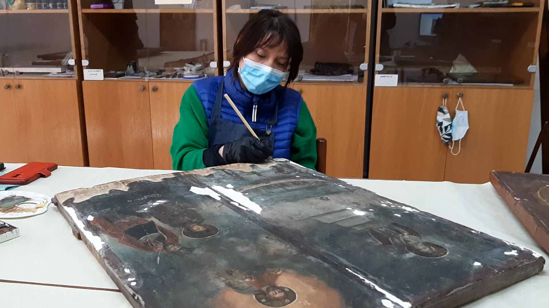 În atelierul/laboratorul de restaurare îi întâlnim pe Elena Panainte, Marian Haivaniuc și Georges Vîrgolici. Pe masa de lucru sunt două icoane alese din depozitul muzeului și care, în urma analizei făcute de o comisie de specialiști din cadrul instituției, vor urma procesul de restaurare.
