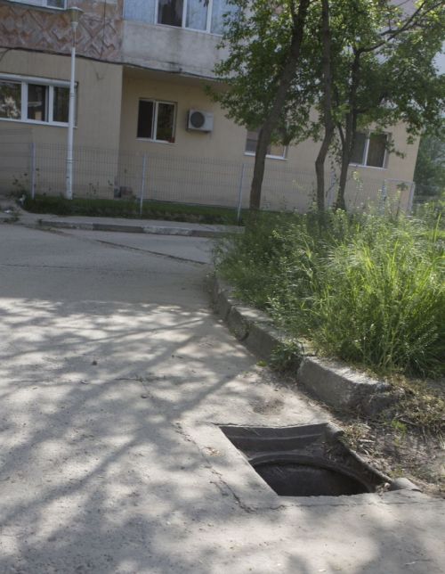 Am întâlnit canalizări descoperite şi pe trotuare. Aici însă locuitorii din zonă au avut grijă să îşi protejeze copii, acoperind găurile cum au putut, cu bucăţi de beton.