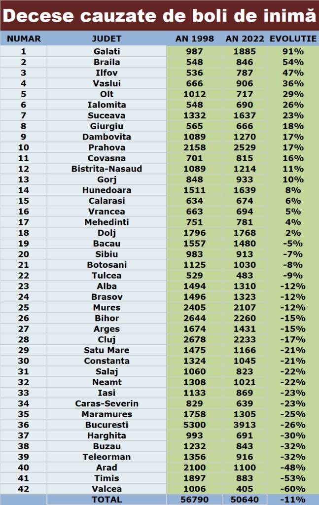Realitatea sumbră a deceselor cauzate de boli de inimă devine din ce în ce mai evidentă în România, iar Galaţiul ocupă un nedorit loc 1 în topul judeţelor.
