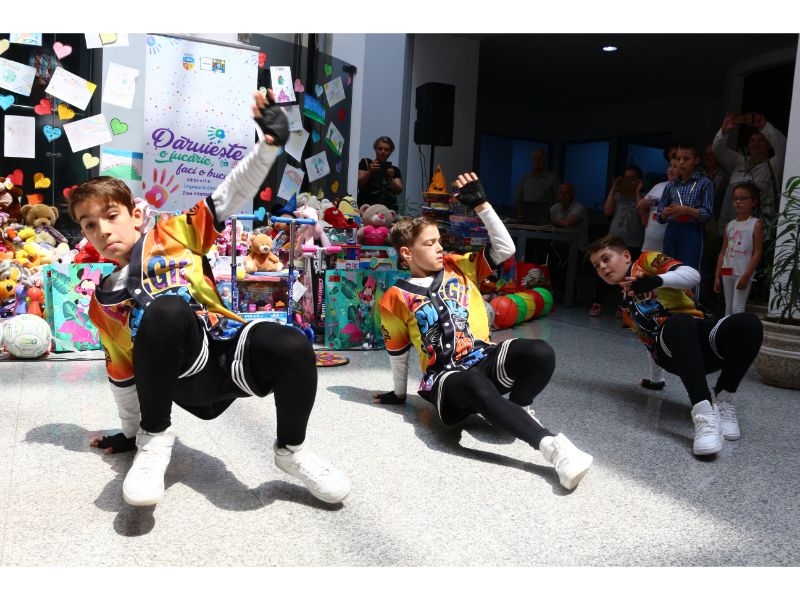 Holul central al Primăriei Galaţi s-a transformat, joi, pentru o jumătate de oră, într-o adevărată scenă. Înconjuraţi de jucăriile ce urmează a fi dăruite de 1 Iunie şi de copii din centrele şi fundaţiile finanţate de Consiliul Local, Filip Cioc, solist al Şcolii de Arte din cadrul Centrului Cultural "Dunărea de Jos", şi trupa de dans "Aqua Boys", de la Estrada Studio din Galaţi, au oferit un spectacol pe cinste.