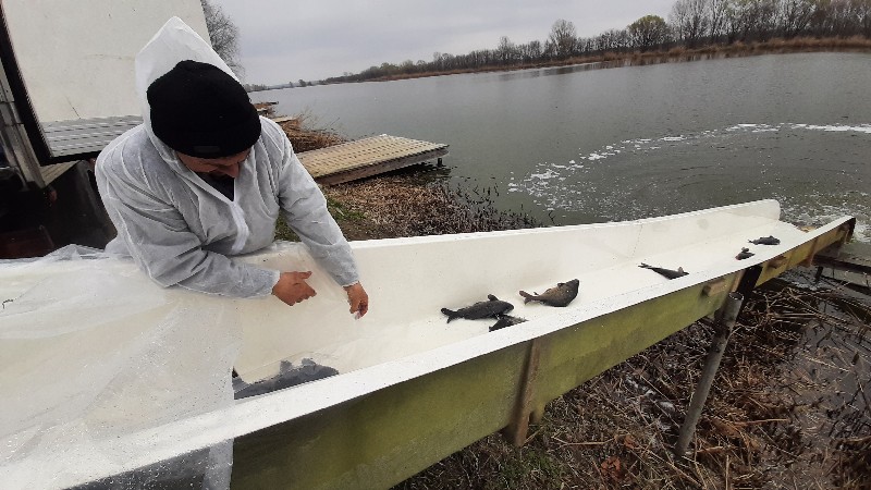 Peștii care s-au mutat ”în casă nouă” la Balta Zătun au fost aduși în niște bazine speciale de specialiștii piscicoli și eliberați în apă cu ajutorul unui tobogan.