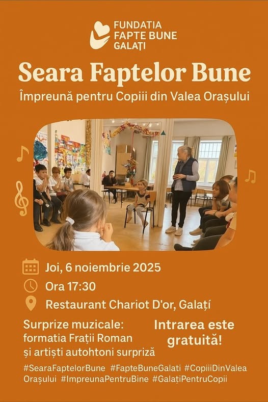 Fundația „Fapte Bune” anunță organizarea evenimentului „Seara faptelor Bune”, un spectacol caritabil ajuns la cea de-a XIII-a ediție, dedicat strângerii de fonduri și sprijinirii Fundației "Cuvântul Întrupat". Aceasta din urmă joacă un rol vital în viața celor 26 de copii din Valea Orașului proveniți din medii vulnerabile, oferindu-le zilnic hrană, educație și momente de joacă.