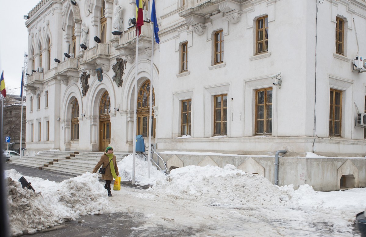 Nici trotuarul din faţa Palatului Justiţiei nu arăta, marţi, mai bine. În jurul prânzului, zona de acces dedicată pietonilor era acoperită în totalitate de zăpadă.