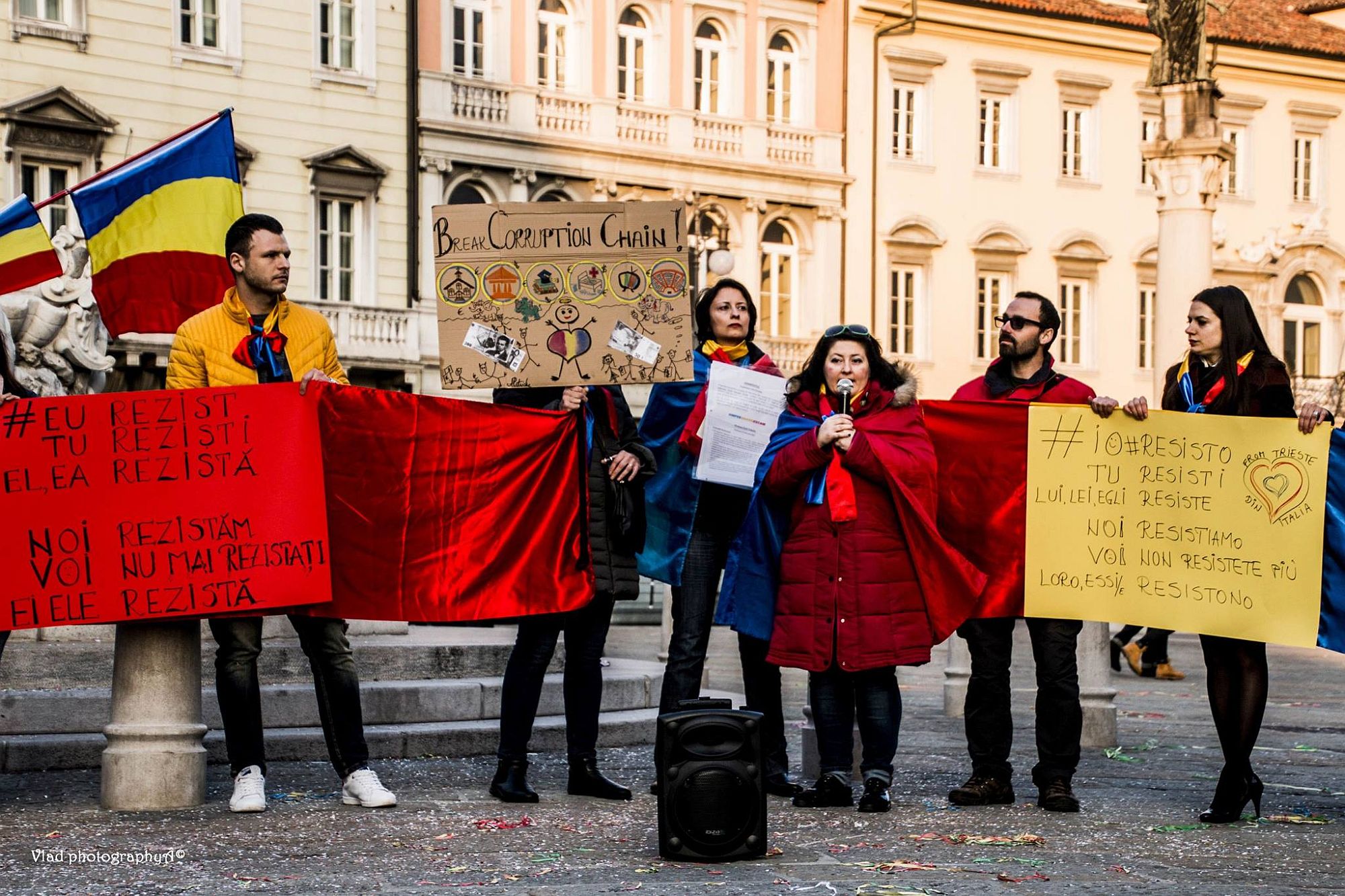 „Duminica trecută a avut loc la Trieste, în Italia, un nou protest de susţinere a manifestaţiilor împotriva corupţiei din România. Au participat rezidenţi români din Trieste, Treviso, Sistiana, Monfalcone şi din Regiunea FVG. Spiritul protestului autorizat de organele locale italiene a fost unul de #REZISTENŢĂ şi de speranţă”, ne-a transmis, într-un comunicat de presă, Adriana Patriche.