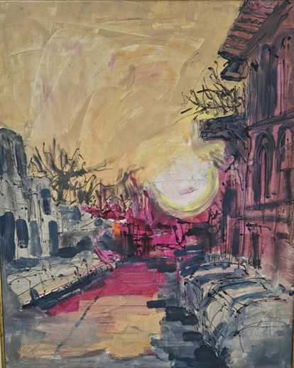 Gheorghe Andreescu, apelând la o tehnică mixtă, la un negru profund și nuanțe de gri, în stilul său expresionist, conturează tot o imagine a iernii, cu arbori supranaturali, care ies chiar prin zidurile unei construcții monumentale și depășesc rama tabloului. Înscrisul hieroglific din partea de jos a suportului se înscrie în maniera caracteristică a artistului, sugerând un timp îndepărtat („Vis de iarnă”).