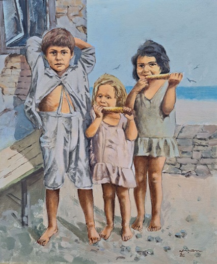 Din seria portretelor și compozițiilor reținem mai întâi, pentru farmecul cu care reliefează inocența și puritatea vârstei, pe cele în care sunt prezentați copii în diferite ipostaze: o fetiță, aflată la o masă în fața unei coli de hârtie, se gândește ce să-i scrie celei căreia i-a dat viață, plecată la muncă în străinătate („Scrisoare mamei”); un băiețel poartă pe luciul apei un vaporaș-jucărie („Jocul copiilor”); trei frați desculți, sărăcăcios îmbrăcați, mănâncă cu poftă porumb fiert („Copii”); un băiat și o fată stau pe o bancă în grădina înflorită, alături de un cățel („Copii în grădină”). Copiii din tablourile lui Teodor Vișan sunt pictați cu neîntrecută forță realistă, sunt concentrați asupra a ceea ce fac, manifestă curiozitate pentru descoperirea lumii din jur, chipul lor exprimă candoare, nevinovăție, unii se bucură pentru ceea ce au, alții fac să ne gândim că nu o duc prea bine. Impresionează sinceritatea și atenția cu care artistul s-a aplecat asupra universului celei mai fragede vârste, reținând aspecte simple din viața copiilor României de astăzi, dar semnificative, în stare să emoționeze, să bucure sau, dimpotrivă, să îndemne la meditație.