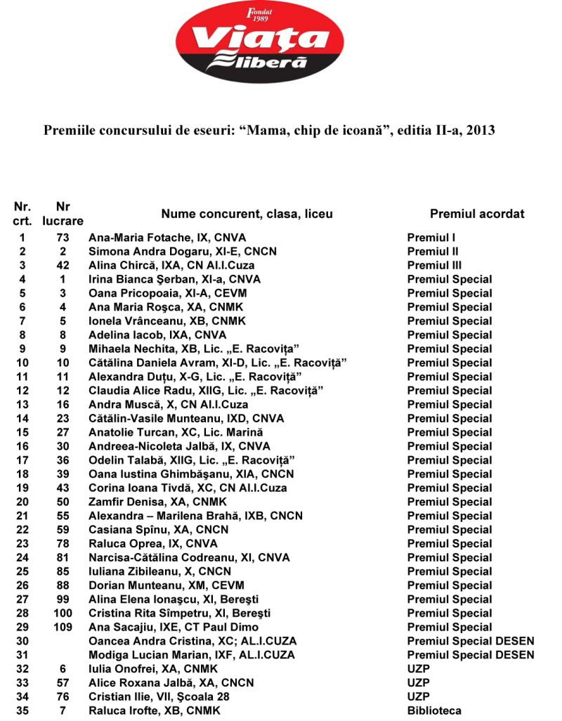 S-au înscris în concurs 112 elevi din 12 licee, scopul fiind cel de a contura cele mai frumoase portrete despre mamă, urmaşă demnă a Maicii Domnului. Alina Chircă, de la Colegiul Naţional “Al. I. Cuza”, a obţinut Premiul al III-lea, ce a constat într-un set cu tastatură şi mouse wireless Microsoft, plus o cameră web Microsoft LifeCam VX-800, în valoare de 200 lei. Premiul al II-lea a fost câştigat de Simona Andra Dogaru, de la Colegiul Naţional „C. Negri”, care a primit o imprimantă multifuncţională Canon Pixma MX395, în valoare de 300 lei. Premiul I a ajuns la Ana Maria Fotache, de la Colegiul Naţional „Vasile Alecsandri”, care a primit o tabletă Smailo Web Energy 8 GB Android 4.0, în valoare de 500 lei, plus publicarea eseului în ziarul „Viaţa liberă”. Toate cele trei premii au fost oferite de SC „Alcopi Birotica” SRL, căreia îi mulţumim pentru susţinere.